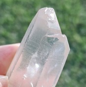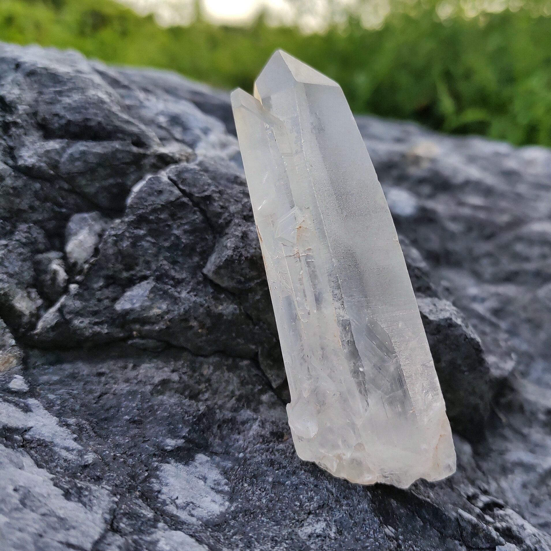 クォーツです。氷のような美しさを纏い、横に刻まれた水晶の成長線であって、ほとんどの锥面にマクロレンズで沢山の逆三角形もあります、神聖な輝きを放ちます。