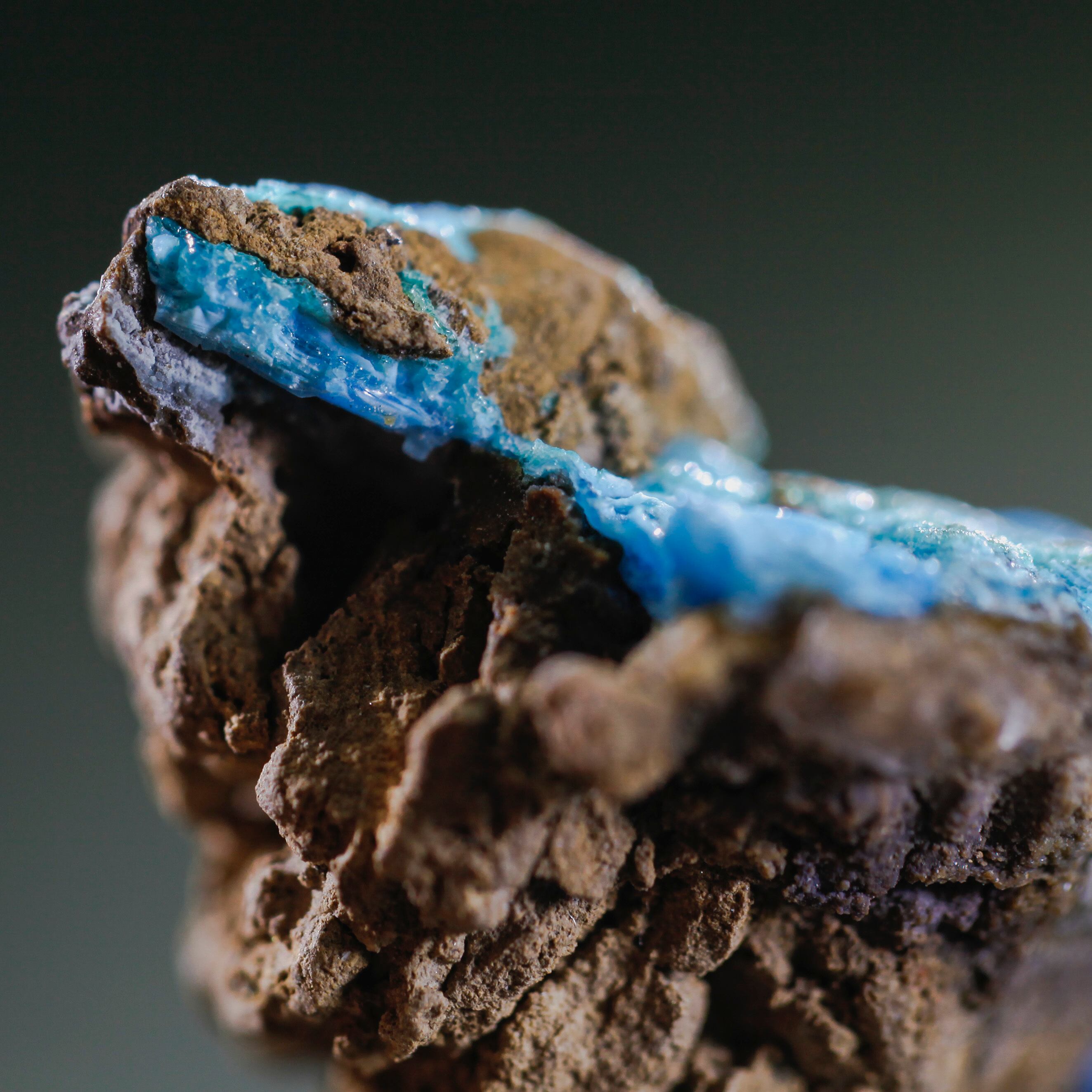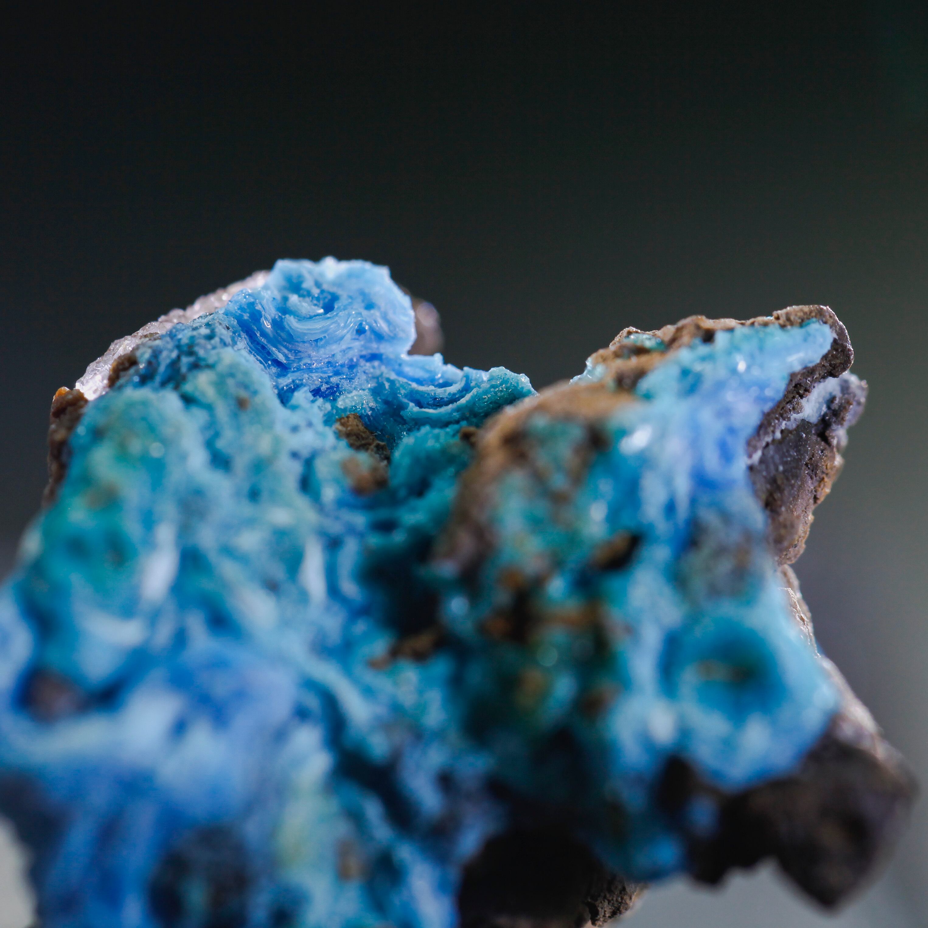 こちらはミニ濃く鮮やかな水色の結晶で、表面は流水が固まったように、光を当てると細かくキラキラと光に反射して綺麗です。
