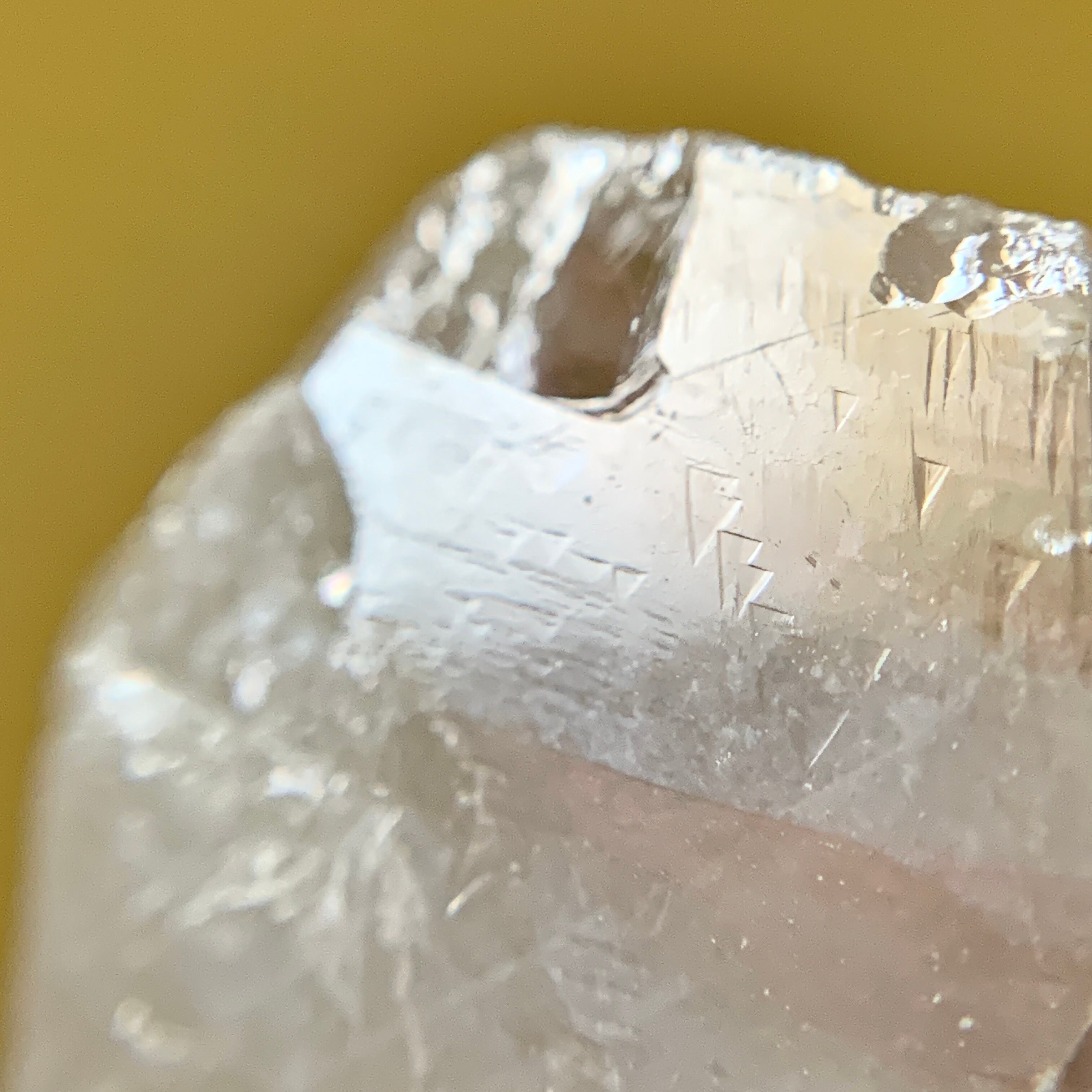 クォーツです。氷のような美しさを纏い、横に刻まれた水晶の成長線であって、ほとんどの锥面に肉眼で逆三角形も沢山あります、神聖な輝きを放ちます。