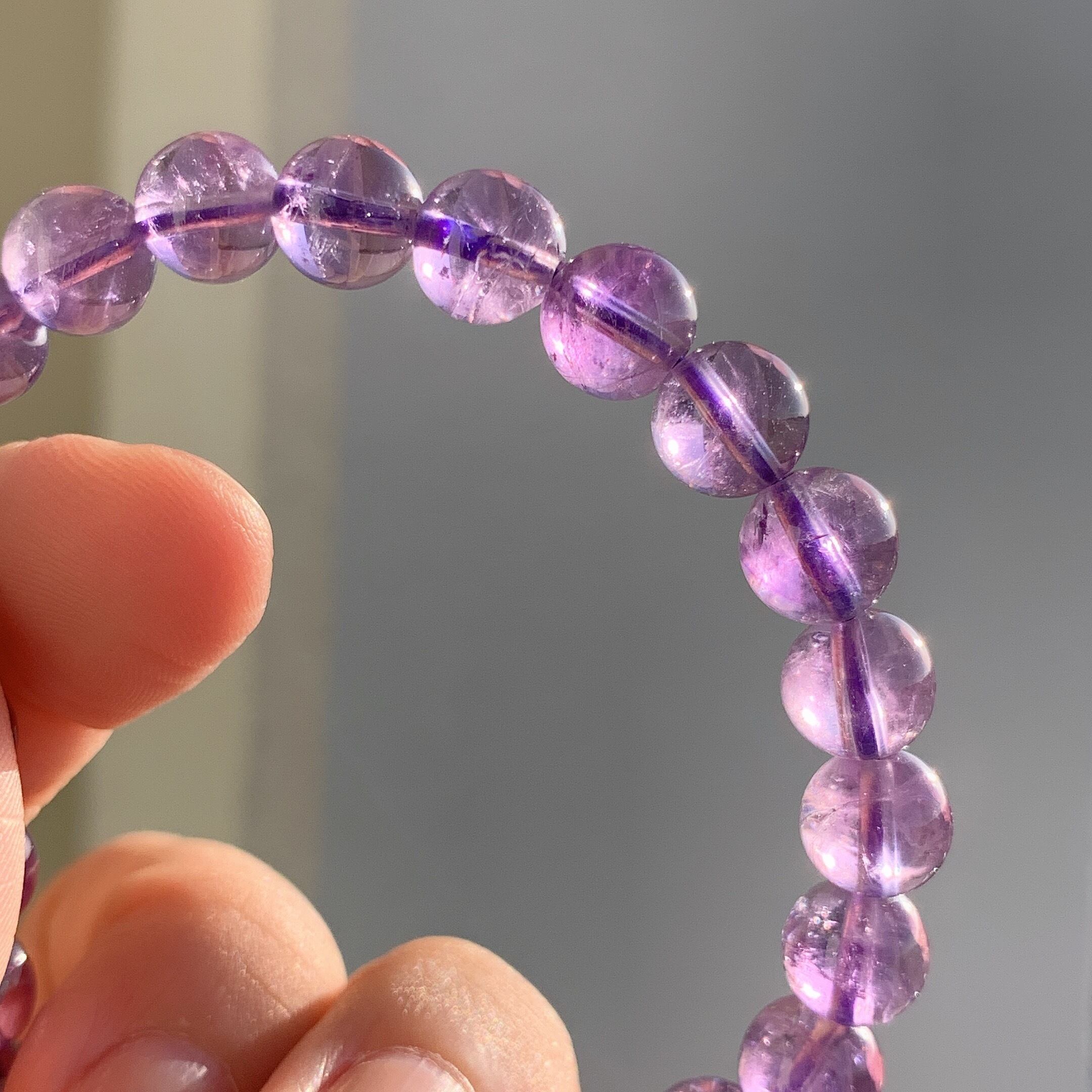 濃い目で、透明感が高いのアメジストです。ビーズには虹がかすかに見えます。精神の疲労、ダメージ、ストレスなどを癒すことで、精神的な不調を徐々に取り除いてくれます。