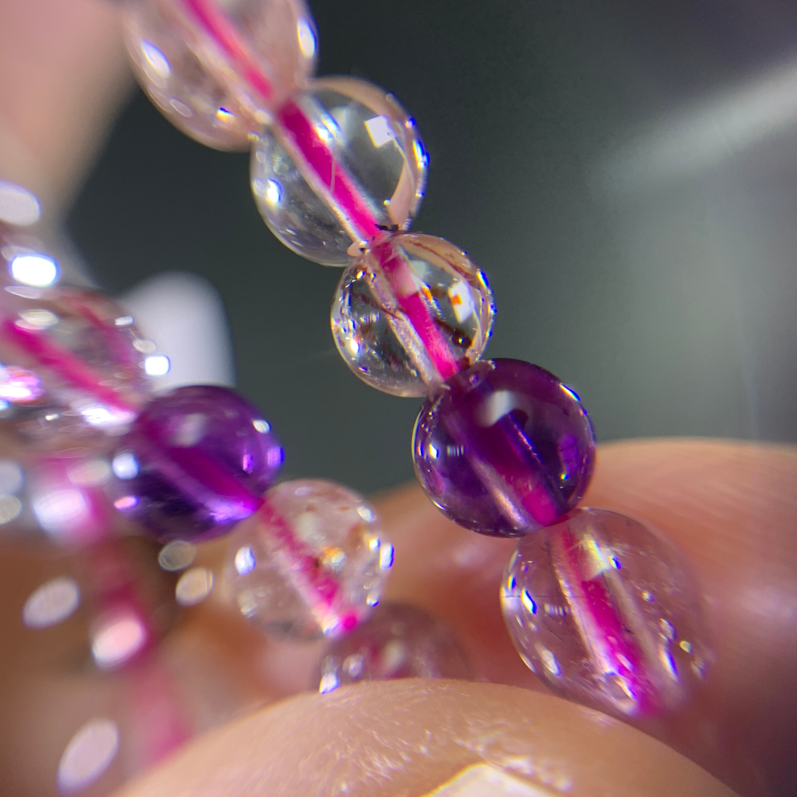 3連宝石質のスーパーセブンです。透明感高い、内包物が大変美しいです。小粒ですが、玉には虹があります。