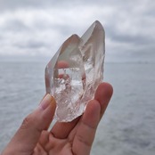大きな希少価値の高い照り艶良く、透明度高くて、ツインのレムリアンシードです。氷のような美しさを纏い、横に刻まれた水晶の成長線であって、肉眼で锥面に三角形も見されています、神聖な輝きを放ちます。大きな虹があるので、光に当たるとキラキラと反射させ、とても綺麗です。