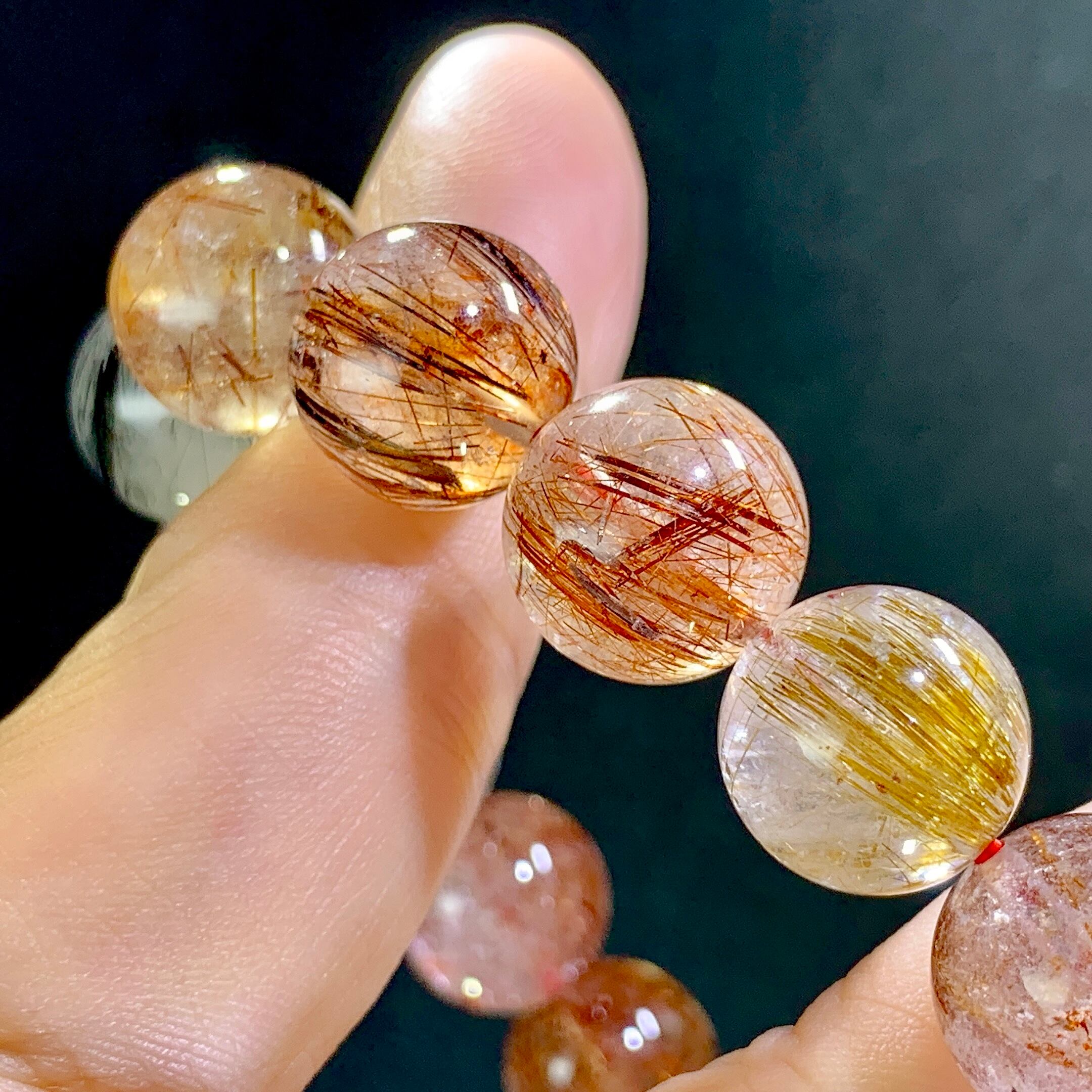 大玉のミックスルチルクォーツブレスレットです。13ミリ,微細な針と太い針がはっきり見させていて、玉に夫々特色があります。希少のブラックルチルクォーツとシルバールチルクォーツがありますので、特に金運アップしています。こちらブレスレットにはタイチンルチルクォーツもあって、優しい色合いで肌なじみも抜群です!