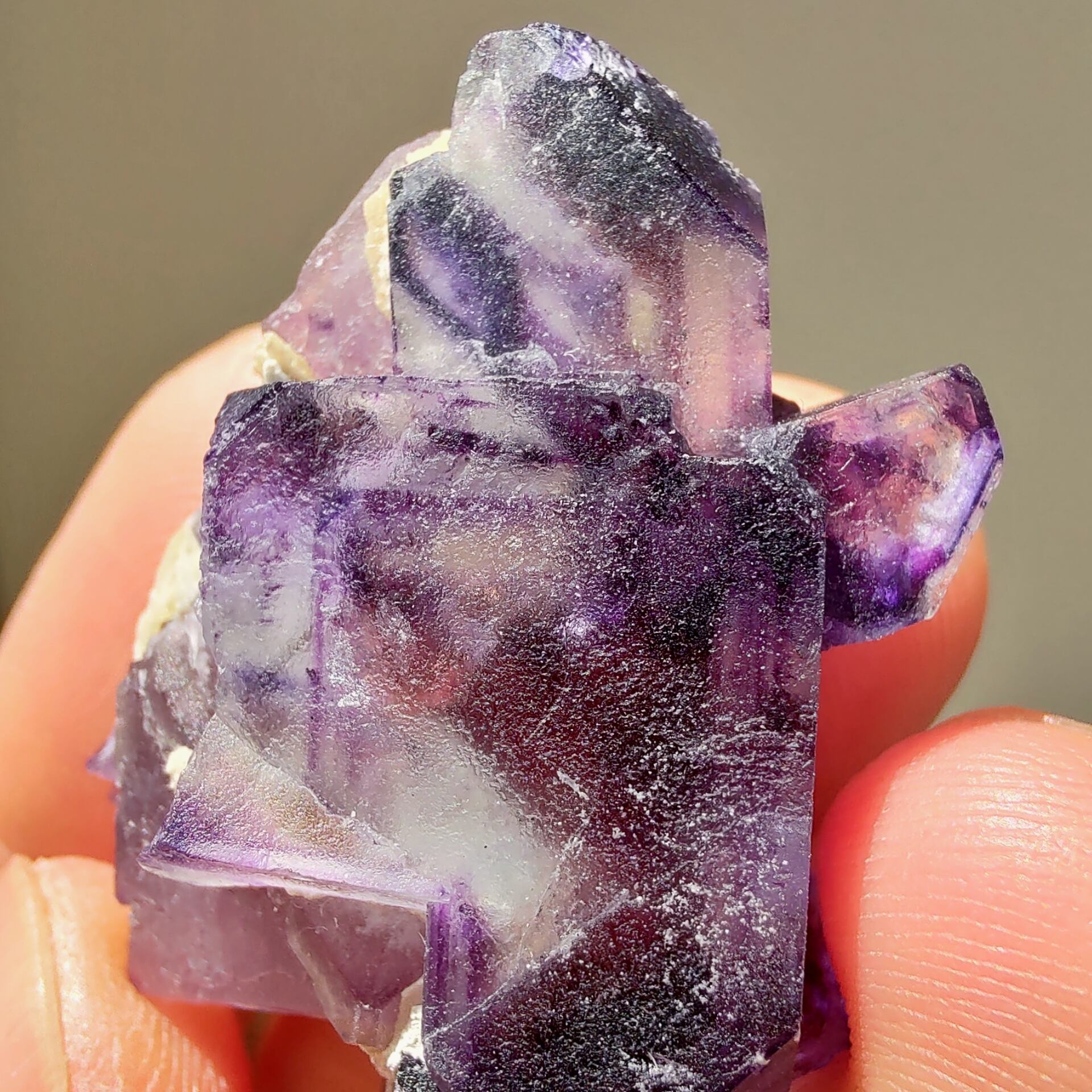 こちらは希少なフローライト、カルサイトと共生した鉱物標本です。薄いパープルの表層、パープルコアが透過光で美しいの色合いが確認出来ます。とっても綺麗です。