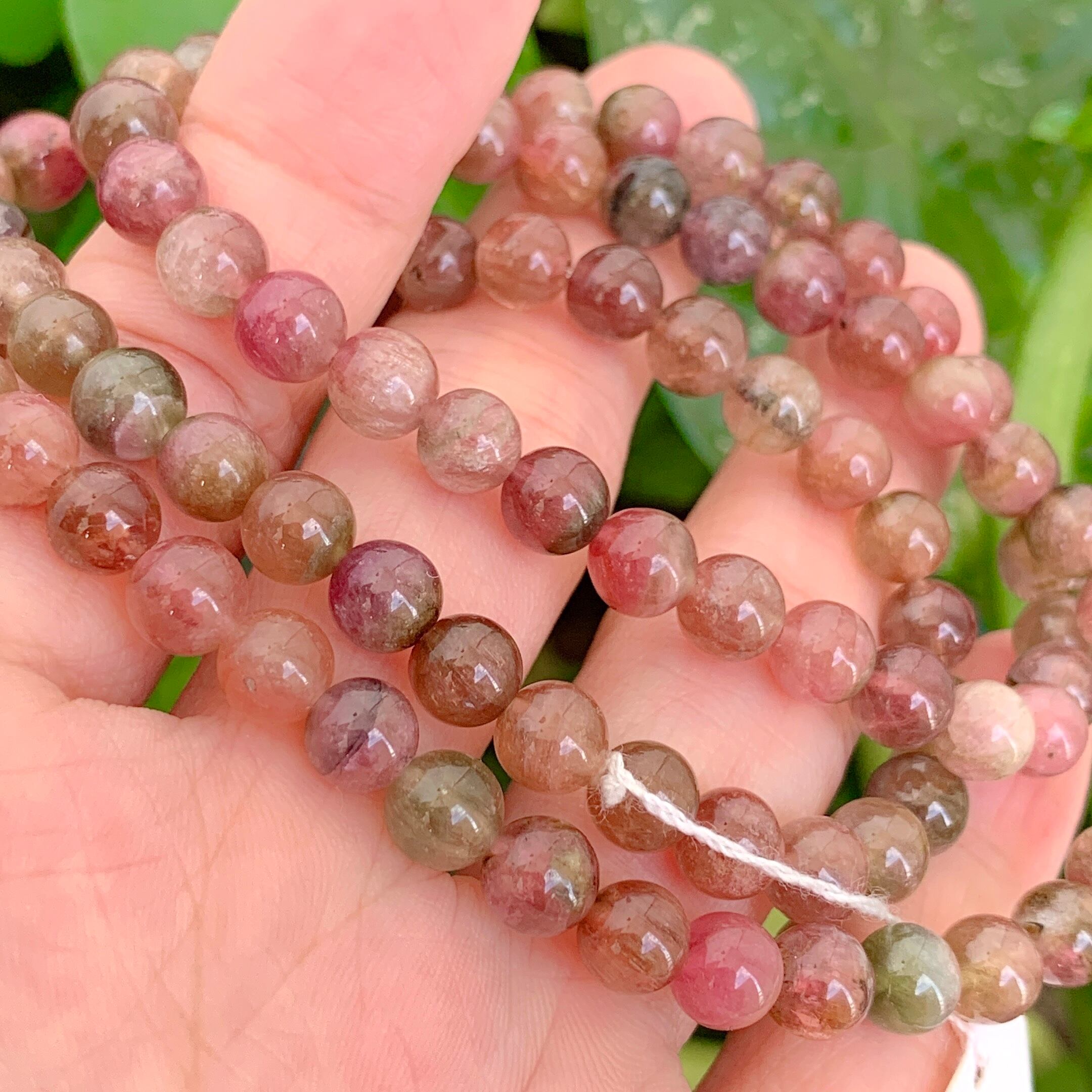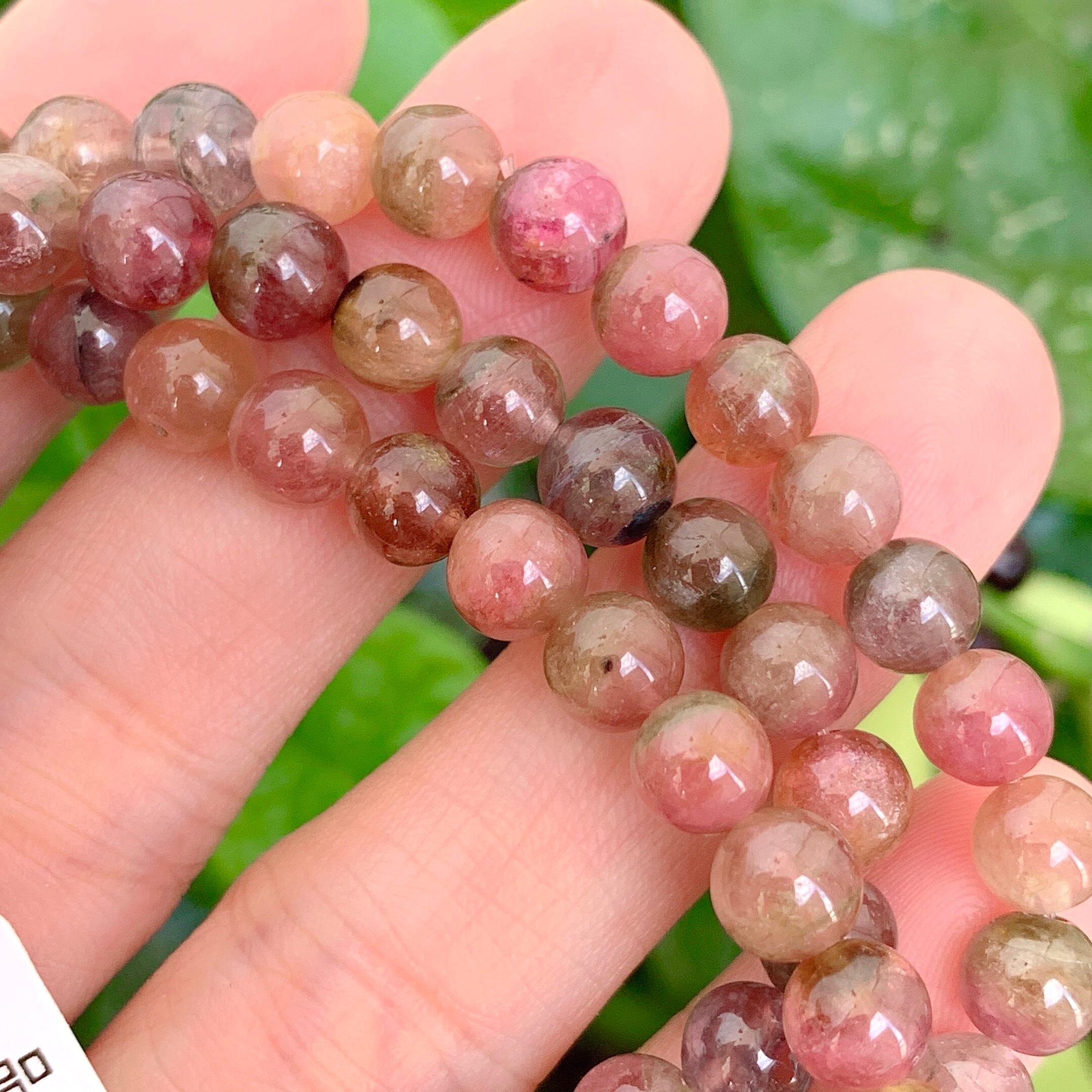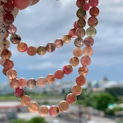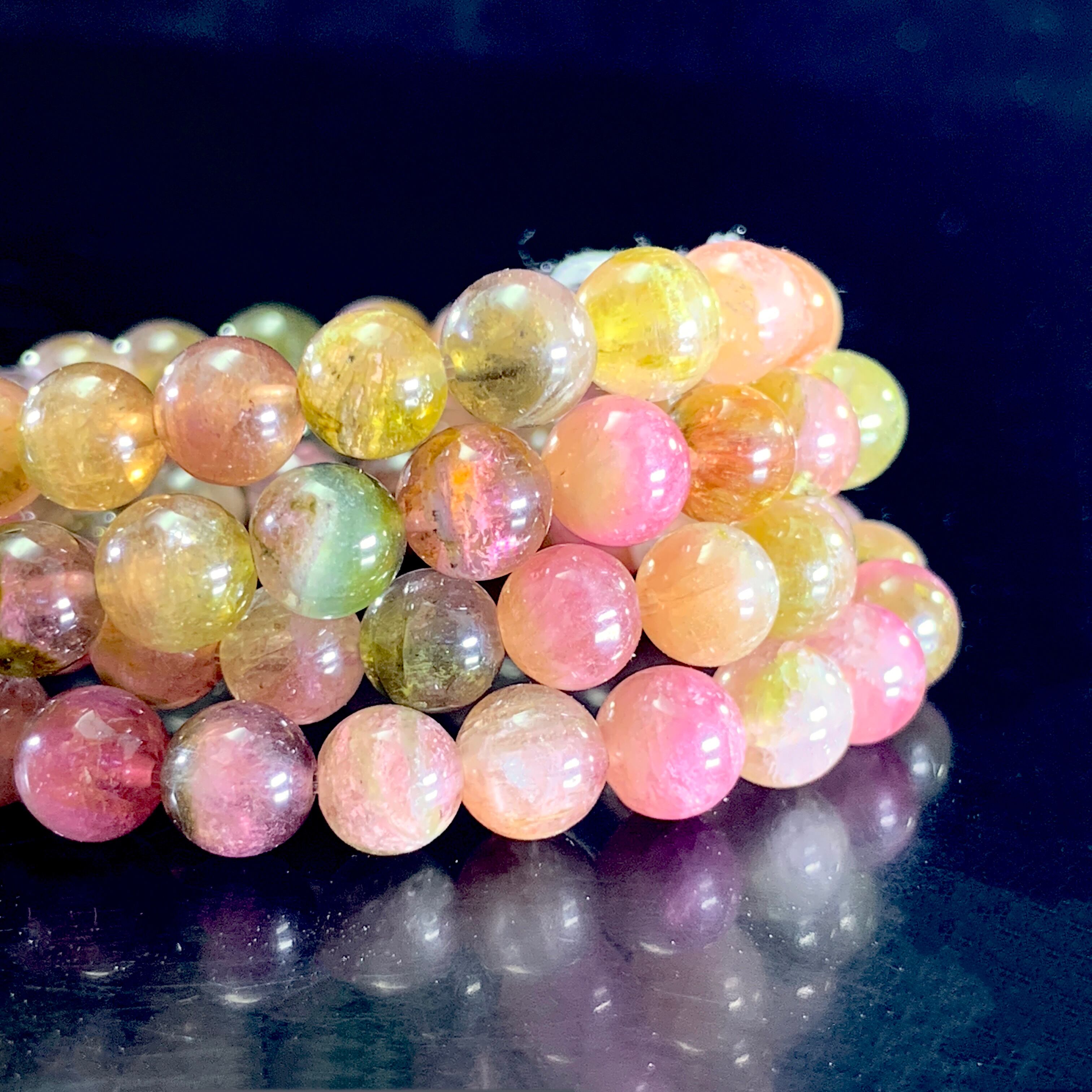 ピンク、イエローグリーン、グリーンのトルマリンのカラーで高さは十分です。光を通したあなただけが楽しめる世界です。トルマリンの中でも1つのクリスタルに2つの色が入ったバイカラートルマリンと呼ばれるものの代表格になります。とても可愛いブレスレットになりますね。