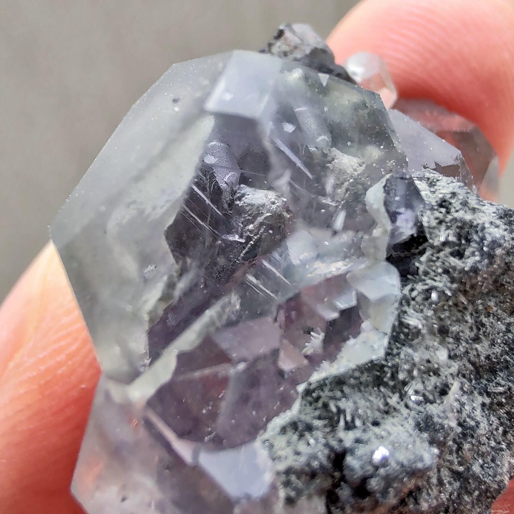 こちらは薄いパープルのフローライトの鉱物標本です。母岩には蛍石の自然の中での原生状態がよく展示されています。テリがクリアでも強い良結晶が見られる景色と、こちらの標本は表面と裏面に色々な角度から楽しめる鉱物標本です。これがまた透けて不思議な雰囲気を見せてくれる得難い鉱物標本です。とっても綺麗です。