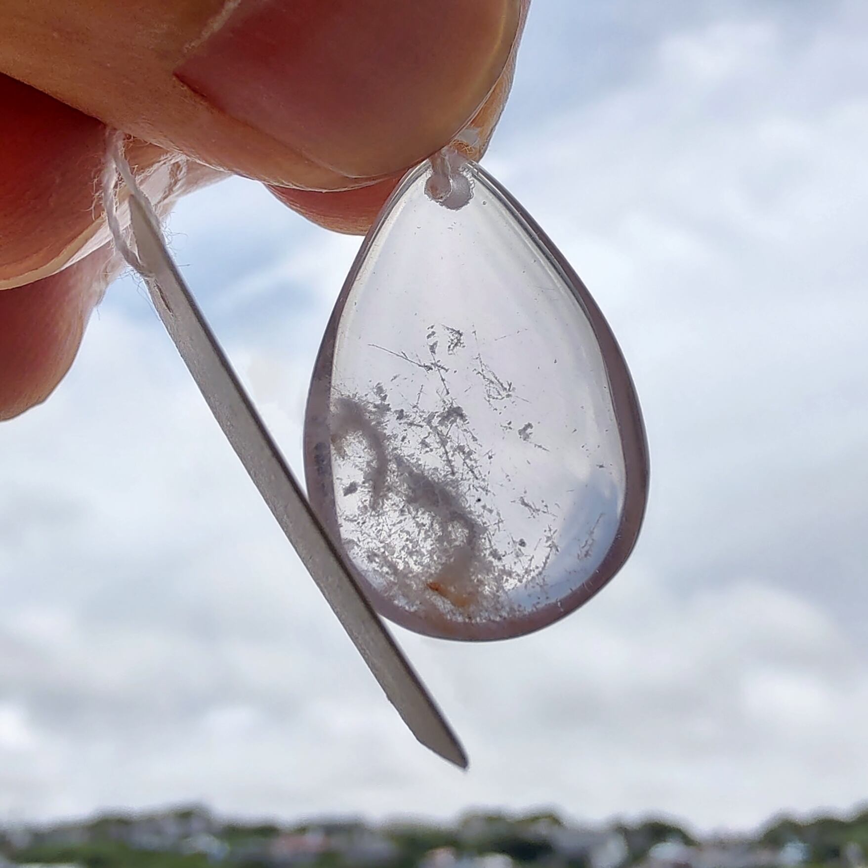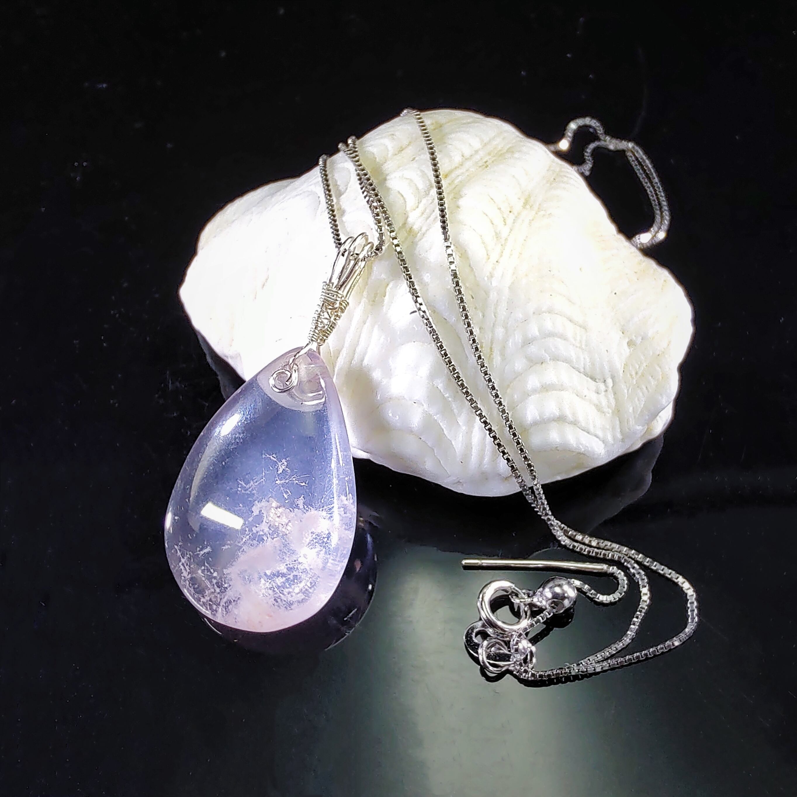 希少なセリサイトのペンダントトップです。淡いピンク(桃色)の美しくやさしい輝きで透明感あふれるローズクオーツの中に、ふわふわとした白い雲/雪のようのインクルージョンを閉じ込めたよう。