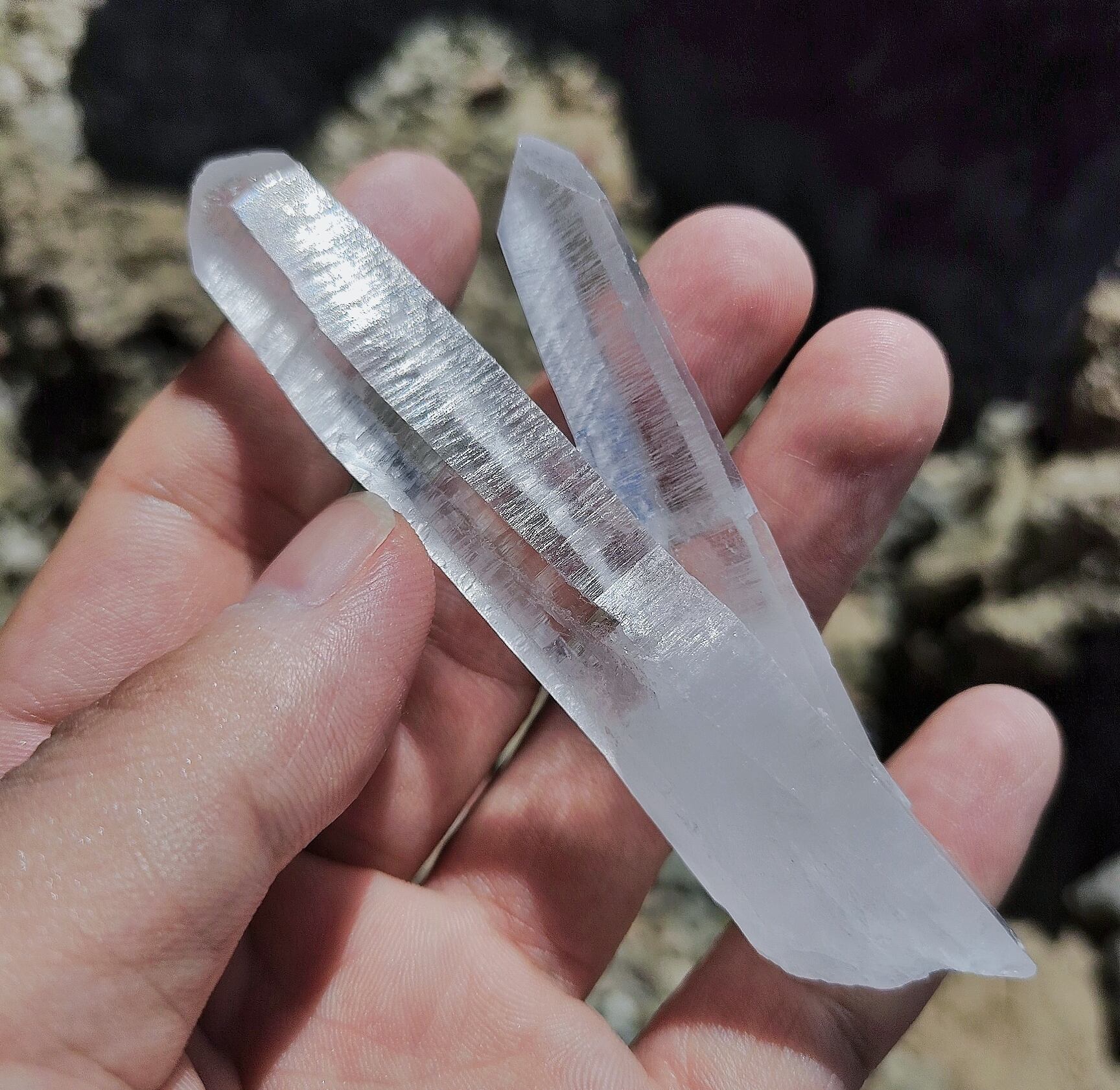 希少な透明度が高い照り艶良く、綺麗なレムリアンシードです。二つポイントは氷のような美しさを纏い、横に刻まれた水晶の成長線であって、虹があるから、とても綺麗です。不可思議なを持っているようです。