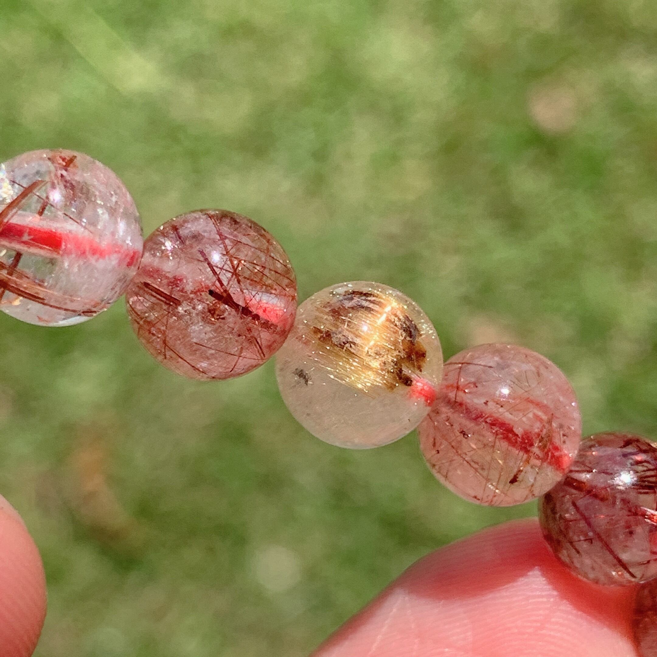 透明度高くて、ミックスルチルクォーツブレスレットです。玉は8.3ミリですが,微細な針がはっきり見させていて、夫々特色があります。希少の薄い青いルチルクォーツがありますので、優しい色合いで肌なじみも抜群です!