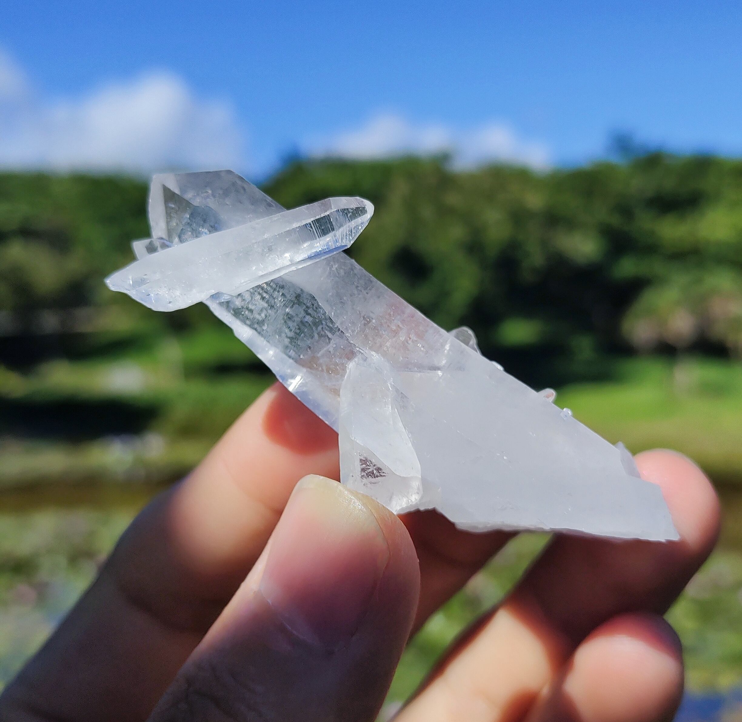 透明度抜群で、希少価値の高い照り艶良く、レムリアンシードです。氷のような美しさを纏い、横に刻まれた水晶の成長線であって、綺麗ですね。クォーツの锥面にはイシスがありますから、そんな偉大な女神の名を持つこの水晶は、女性的な優しいエネルギーを持ち、傷ついた心を癒す働きがあるといわれています。