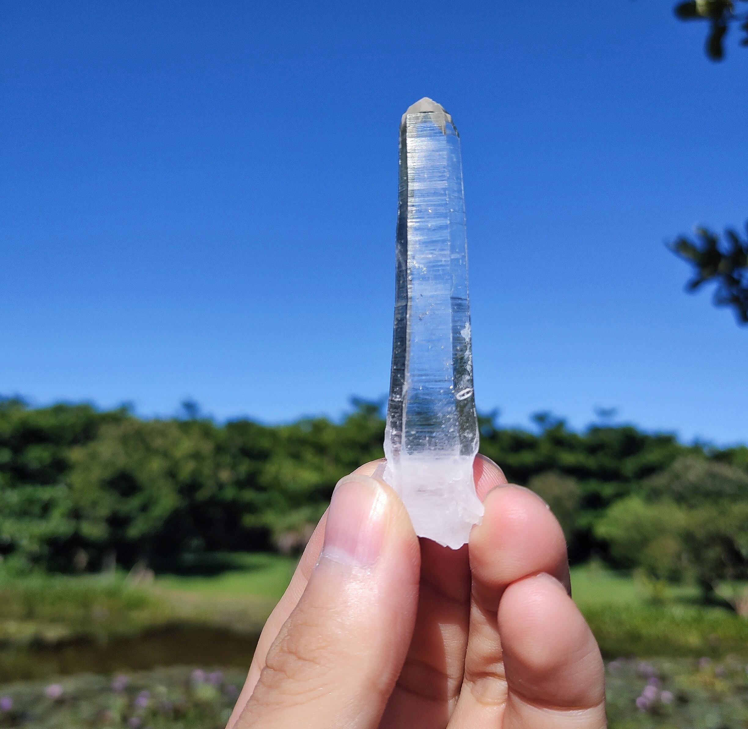 希少な透明度が高い照り艶良く、綺麗なレムリアンシードです。シングルポイントは氷のような美しさを纏い、横に刻まれた水晶の成長線であると、不可思議なを持っているようです。