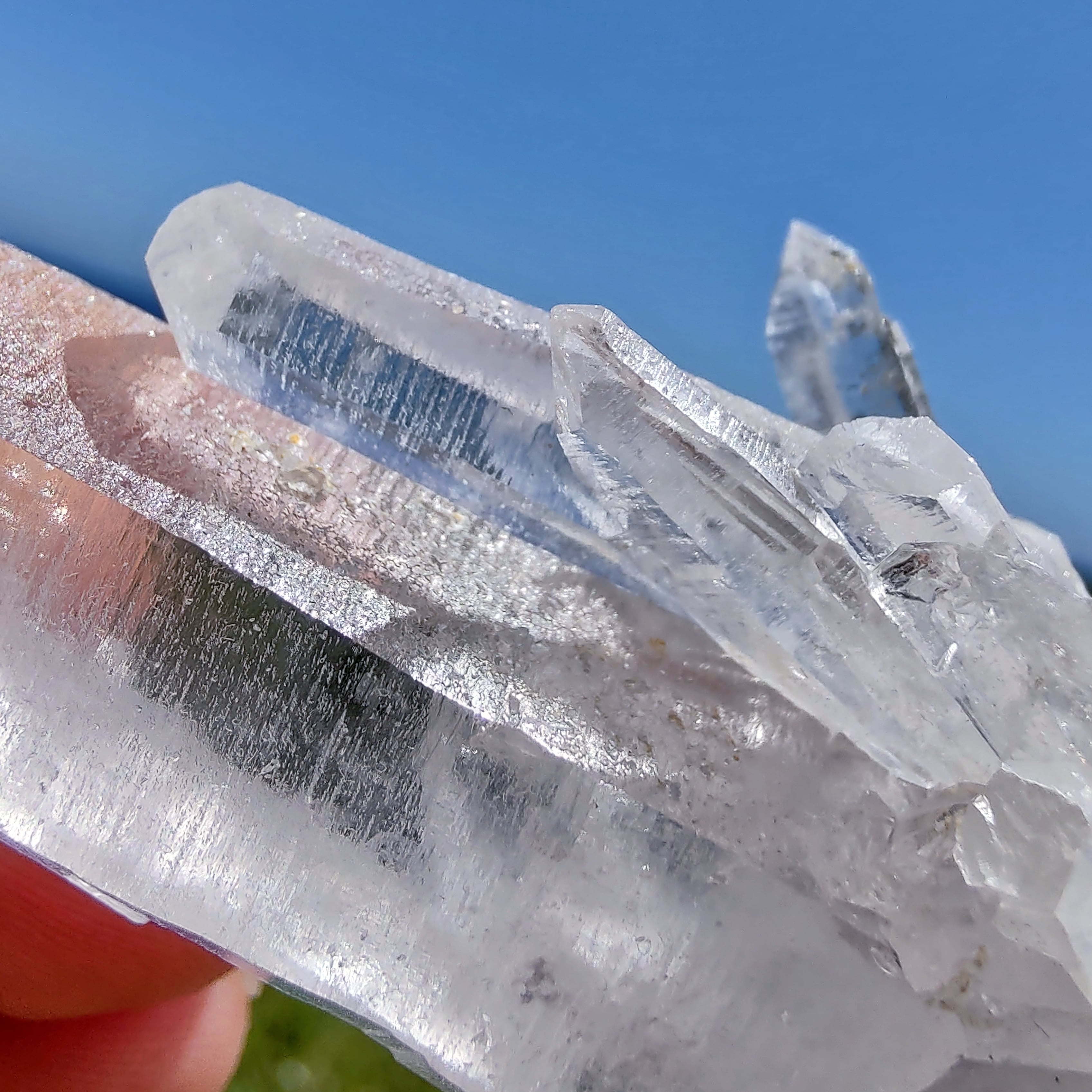 希少価値の高い照り艶良くタントリックツインのレムリアンシードです。氷のような美しさを纏い、横に刻まれた水晶の成長線であります。小さい水晶の先端部に七角形になっている、レシーバーと呼びます。神聖な輝きを放ちます。二つのクリスタルが共通(一つ)の根元から成長していますので、タントリックツインと言います。人と人との結びつき、更にはあらゆる物ごとに対して調和をもたらしてくれるといわれています。