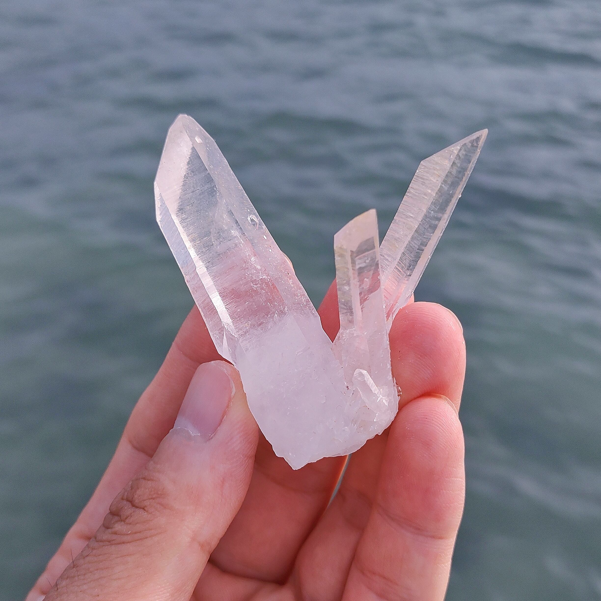 大きくて、希少な透明度が高い照り艶良く、綺麗なレムリアンシードのクラスターです。3つ大きいクォーツが立てて、錐面に肉眼で三角形▲が沢山見える、不可思議なを持っているようです。