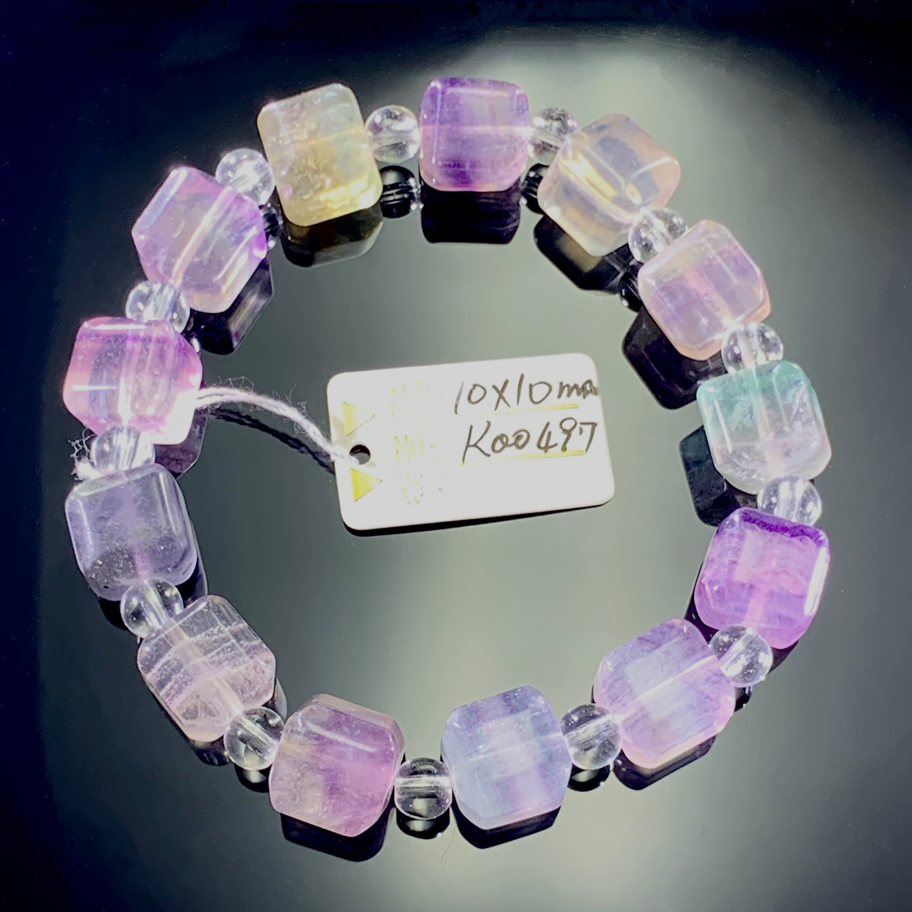 透明度が高くて、むらさき、ピンク、グリーン合いが綺麗なキューブのフローライト、とても可愛いブレスレットになりますね。ひとつひとつのフローライトキューブにはそれぞれ特色があり、その中の1つには虹も見えます。とても面白いですね。