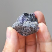 こちらはパープルのフローライトとカルサイトの鉱物標本です。蛍石の自然の中での原生状態がよく展示されています。テリが非常にクリアでも強い良結晶が見られて、景色と虹も見られて、色々な角度から楽しめる鉱物標本です。カルサイトが小さくて、ぎっしりと集まって、自然光の下キラキラしています。