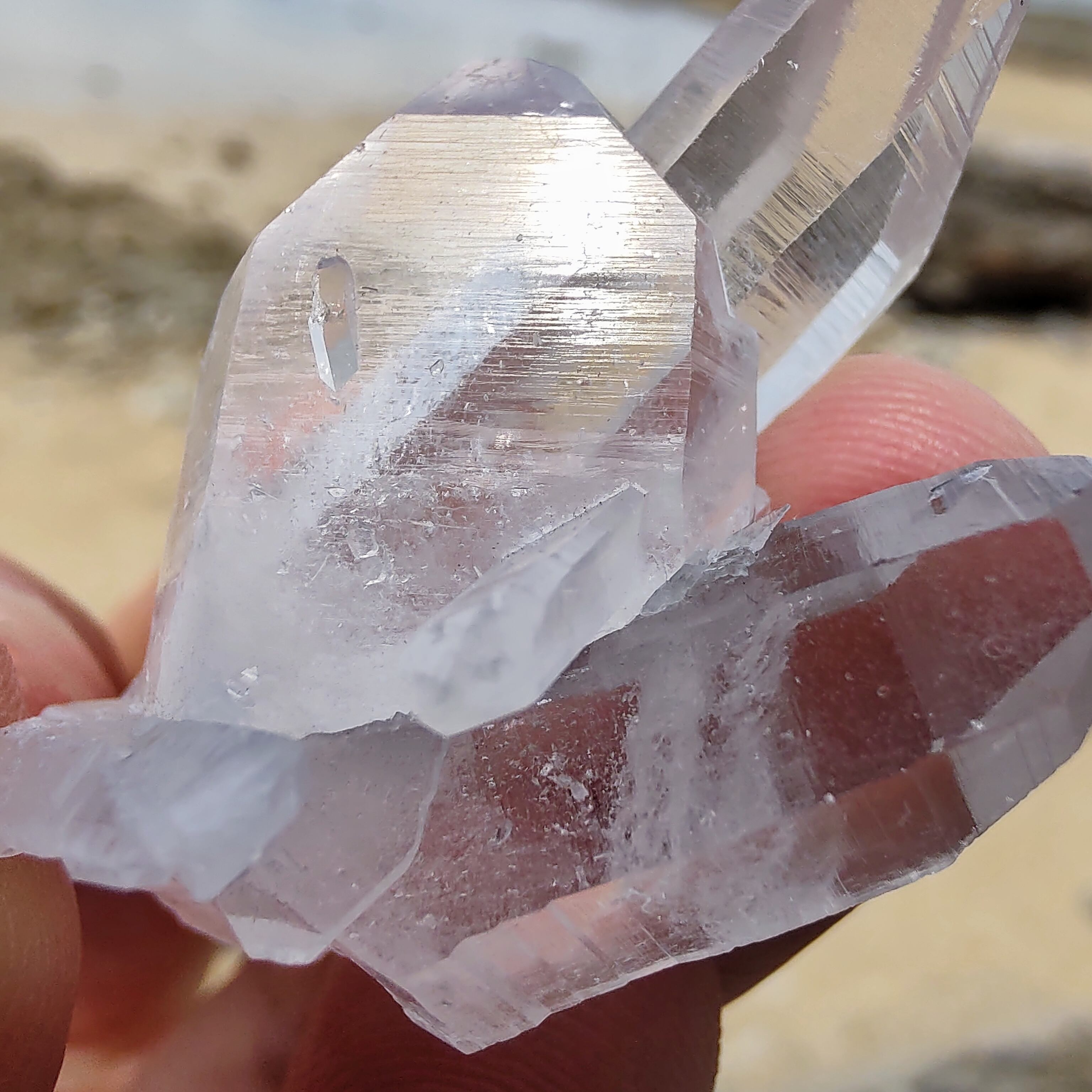 希少な透明度が高い照り艶良く、綺麗なレコードキーパーです。サボテンのように、自然光の下、虹も見えます。メインクォーツには小さいクォーツが成長している、とても可愛いです。錐面に肉眼で三角形▲が沢山見える、不可思議なを持っているようです。