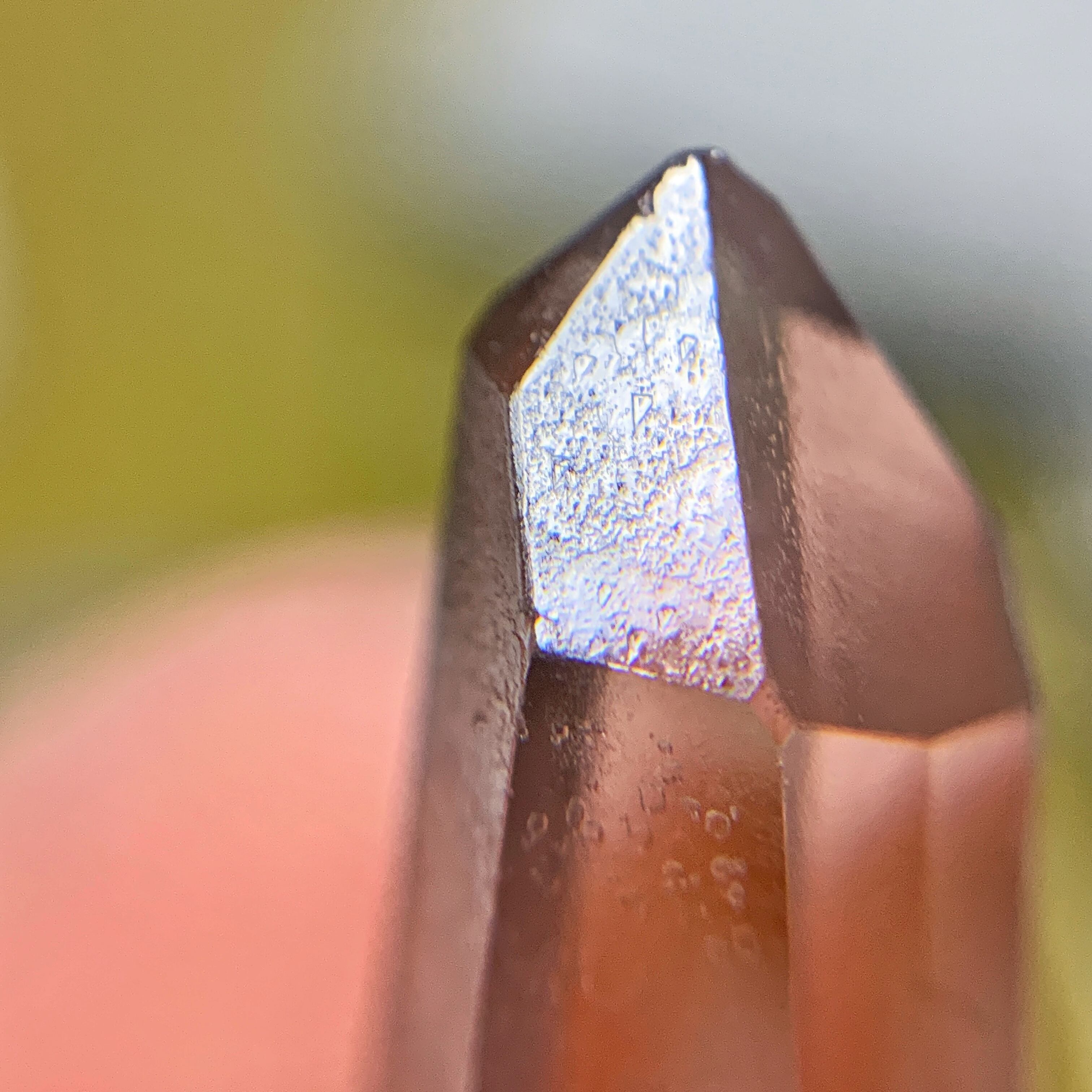 こちらは希少な極透明で艶もあった、光あふれる出るような松茸水晶です。クォーツのどの锥面にもいっぱい逆三角形▼の凹凸が見って、強いエネルギーを持っているようです。これはお珍しい。