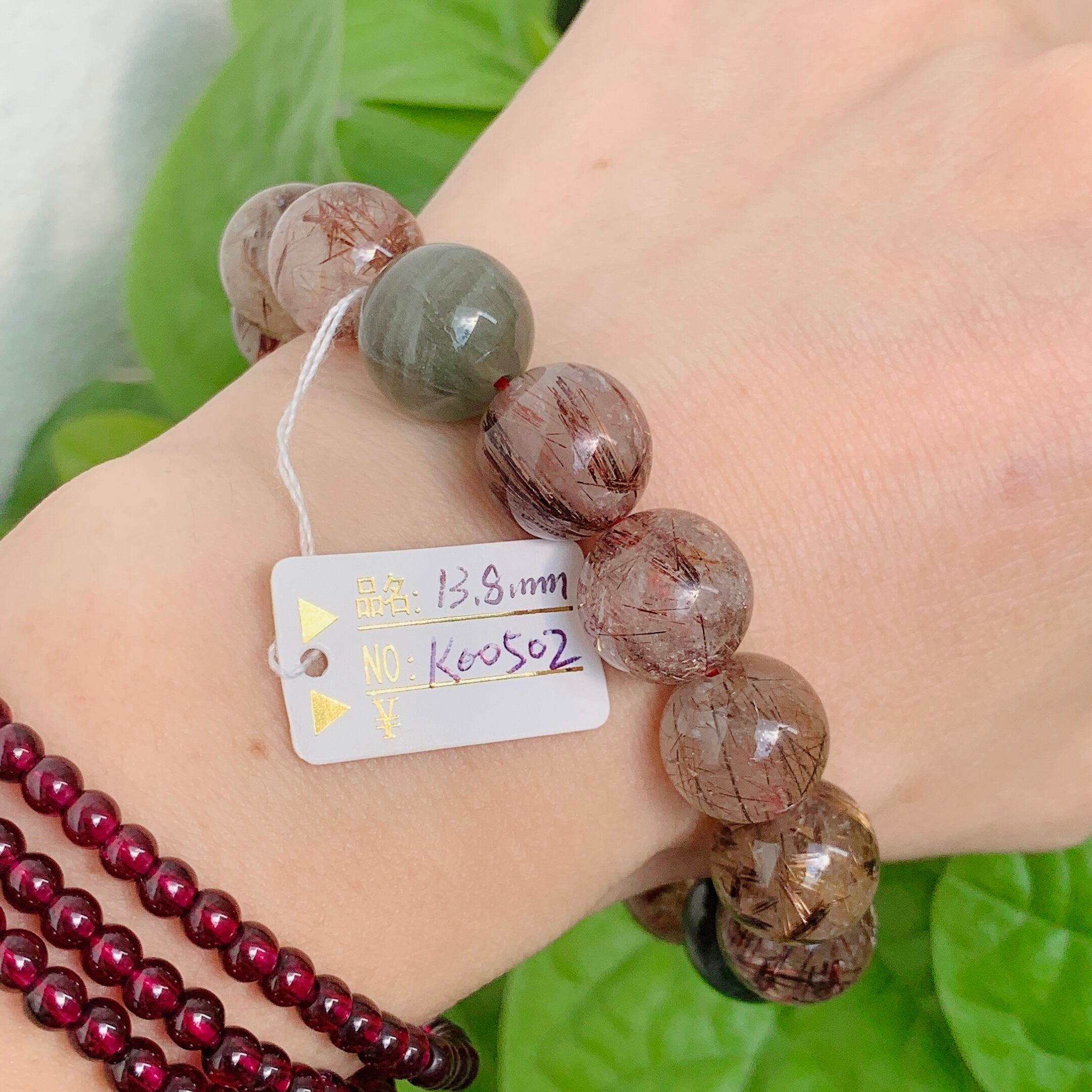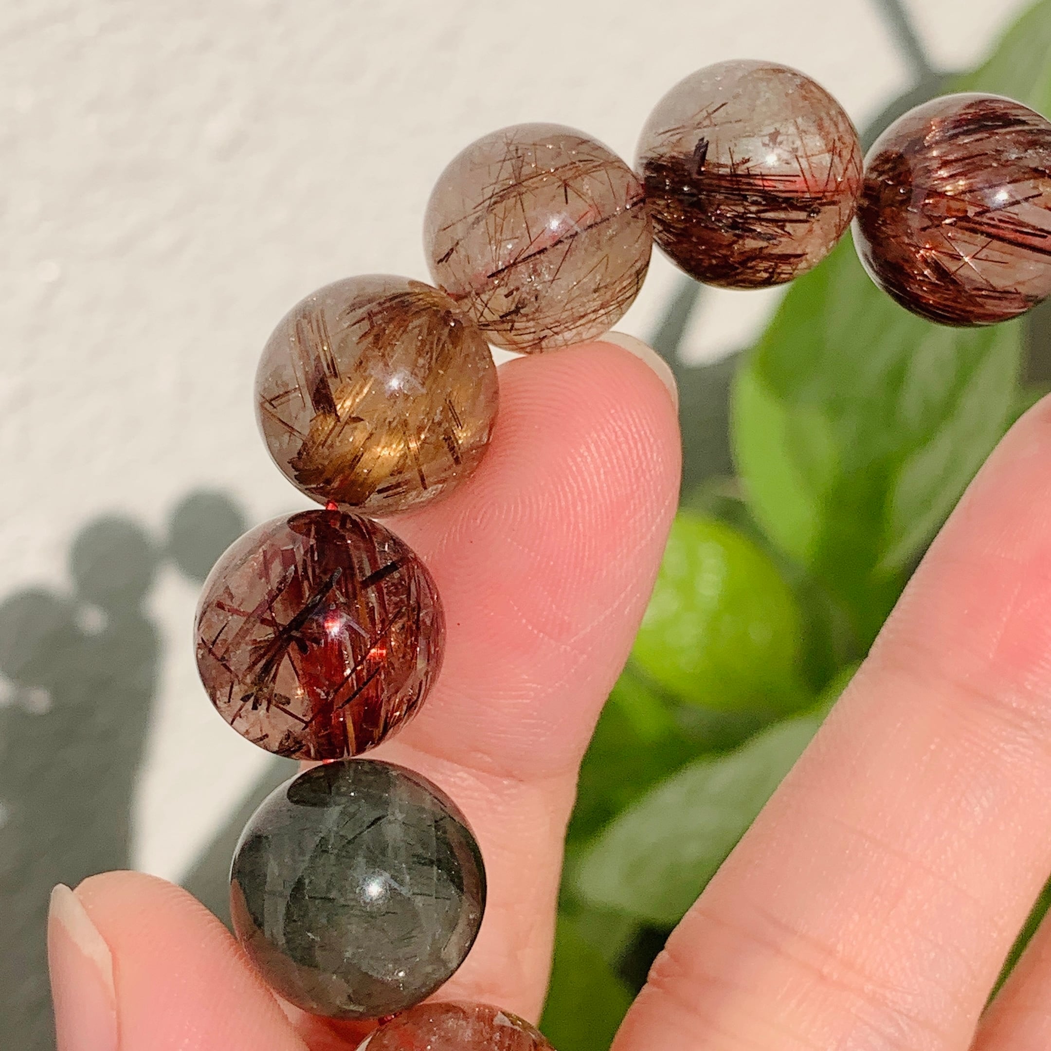 大玉のミックスルチルクォーツブレスレットです。13.8ミリ,微細な針と太い針がはっきり見させていて、玉に夫々特色があります。ブラウンルチルクォーツとグリーンルチルクォーツがありますので、特に金運アップしています。こちらブレスレットにはタイチンルチルクォーツもあって、優しい色合いで肌なじみも抜群です!