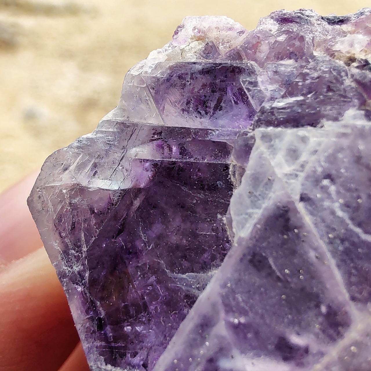 母岩に濃いパープル、薄いパープル、ピンクとの結晶はクリアでテリが強く、表は、恐らく蝕像と思われる凹凸が見られ、これがまた透けて不思議な雰囲気を見せてくれる得難い鉱物標本です。とっても綺麗です。