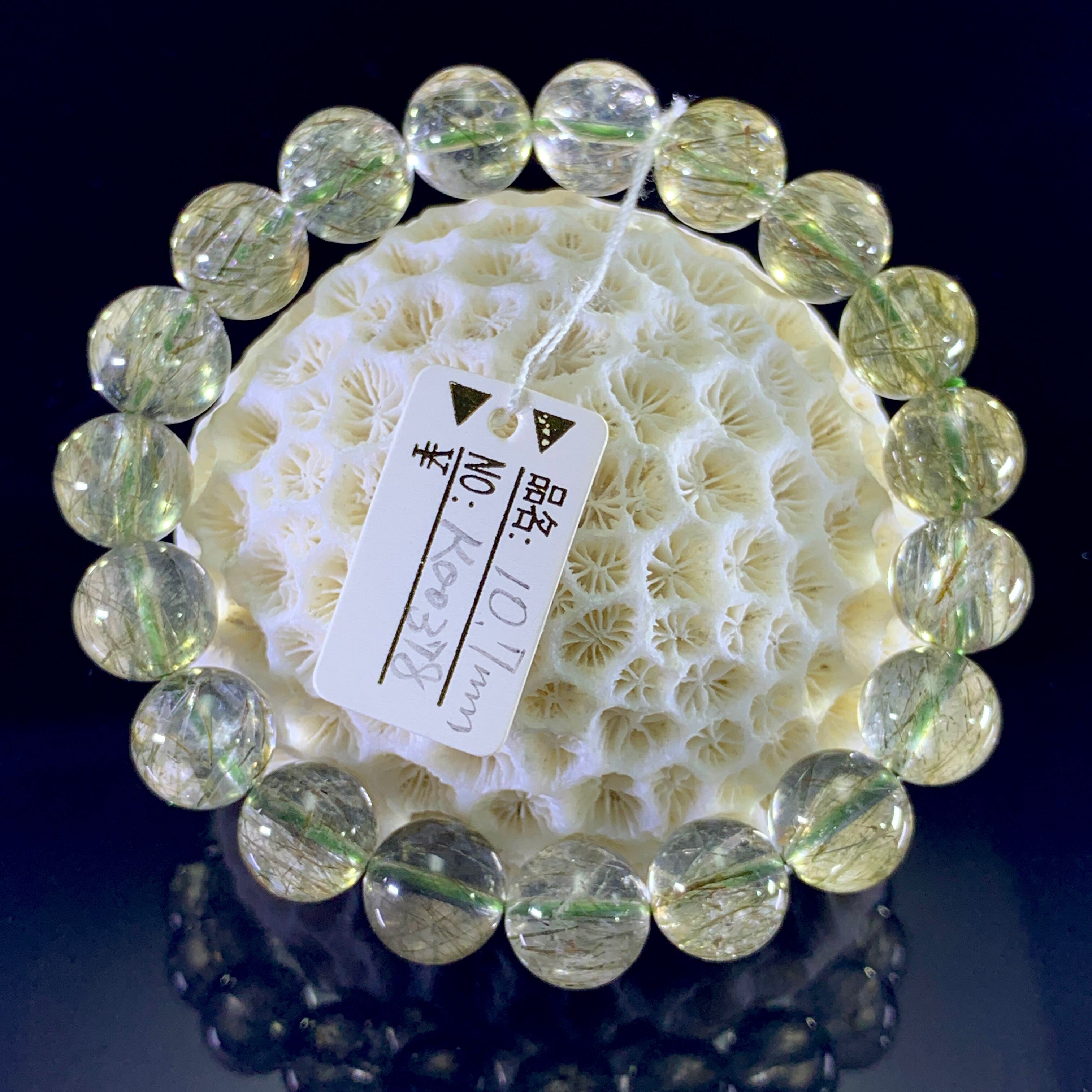 若草を透明度の高い水晶の中に閉じ込めたような爽やかなブレスレットです。虹が入ってキラキラ。グリーンエピドートはエピドートグループの中で鉄を10%以上含有したものを指し、柱状の結晶が密集して構成されています。その様子からギリシャ語で増加という意味を持つ「epidosis」が語源になったといわれており、和名では緑色の簾(すだれ)のようだということで「緑簾石(りょくれんせき)」と呼ばれています。