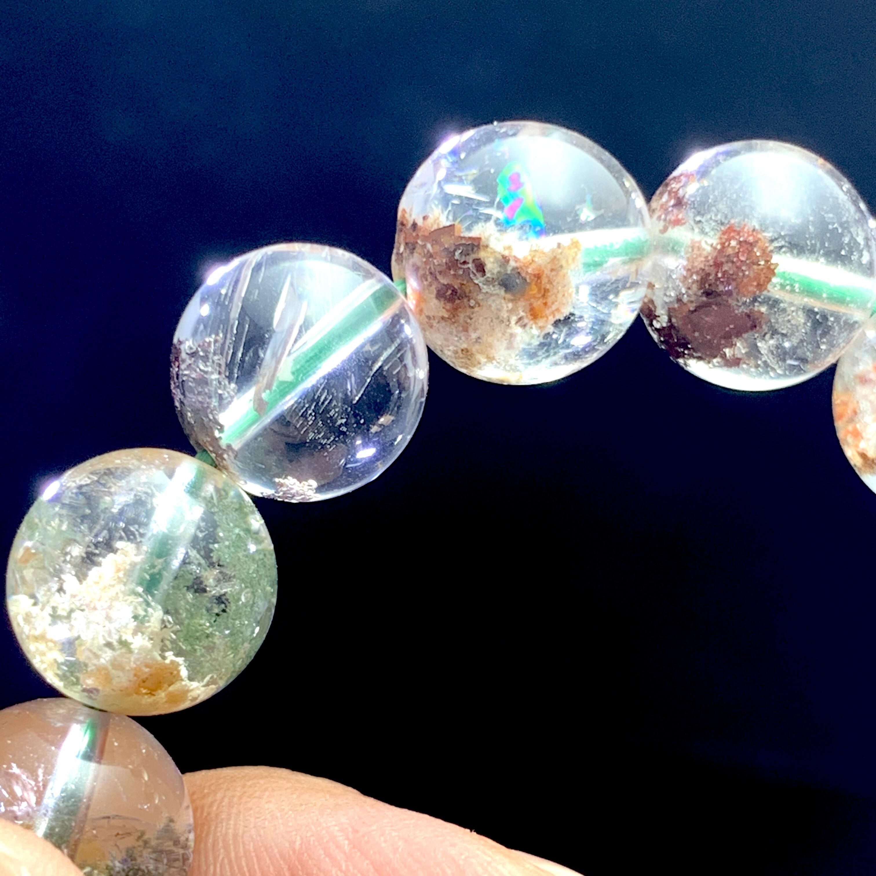 透明感が拔群で虹のあるガーデンクォーツのブレスレットです。クリスタルの内部に緑泥石が内包することにより、庭園のように見えることからその名が付けられました。見る人にやすらぎと平和をもたらしますので、風水の世界では病気を回復に向かわせる水晶として広く知られています。