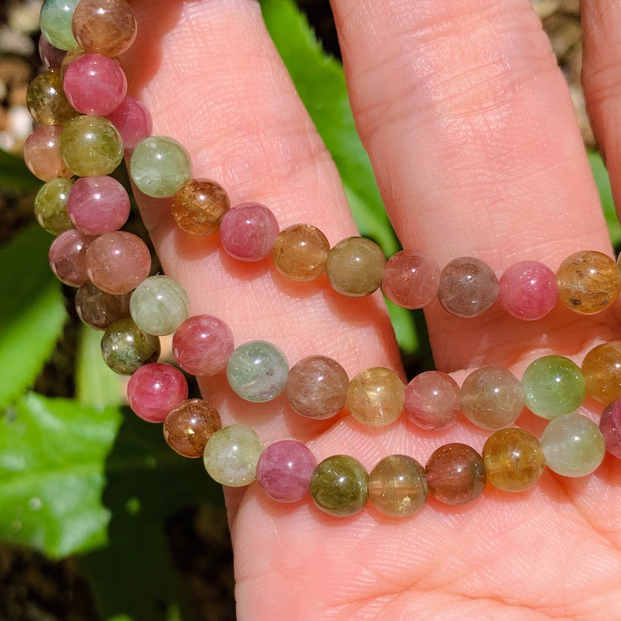 マルチカラートルマリンです。薄いグリーン、イエロー、ブラウン、ピンクのトルマリン、とても多種多様な色彩を持ち、カラーバリエーションの豊富さはパワーストーンの中でも随一と言われております。トルマリン玉は小さいですが、キャットアイ效果を見られます。とっても可愛いブレスレットになりますね。