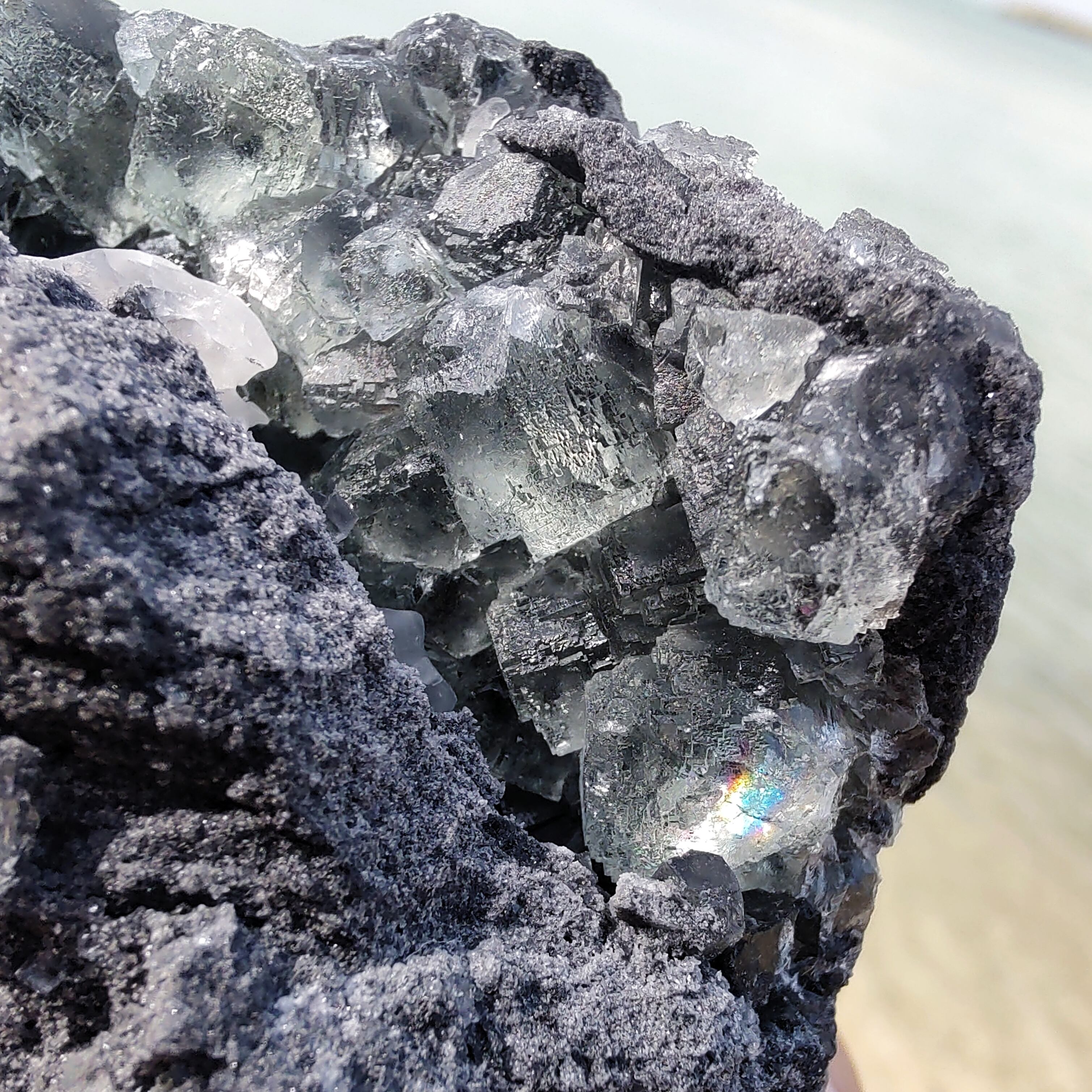 大きくて、透明感高くて、静謐なブルーグリーンフローライトの鉱物標本です。重さ108gです。母岩に薄い水色のフローライトが沢山集まっていています。見応えのある大小さまざまな立方体やステップ状結晶の爽やかな色合いが魅力的で、立体感豐かな美しいて、結晶のテリ感も良好です。置物として、綺麗ですね。写真より、実物はもっと美しく見える。見てみよう✨