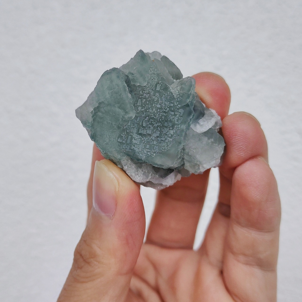 透明感が抜群、モランディ色できれいなフローライト鉱物標本です。見応えのある四角の淡いグリーンで、別名はQRコード蛍石も言われています。