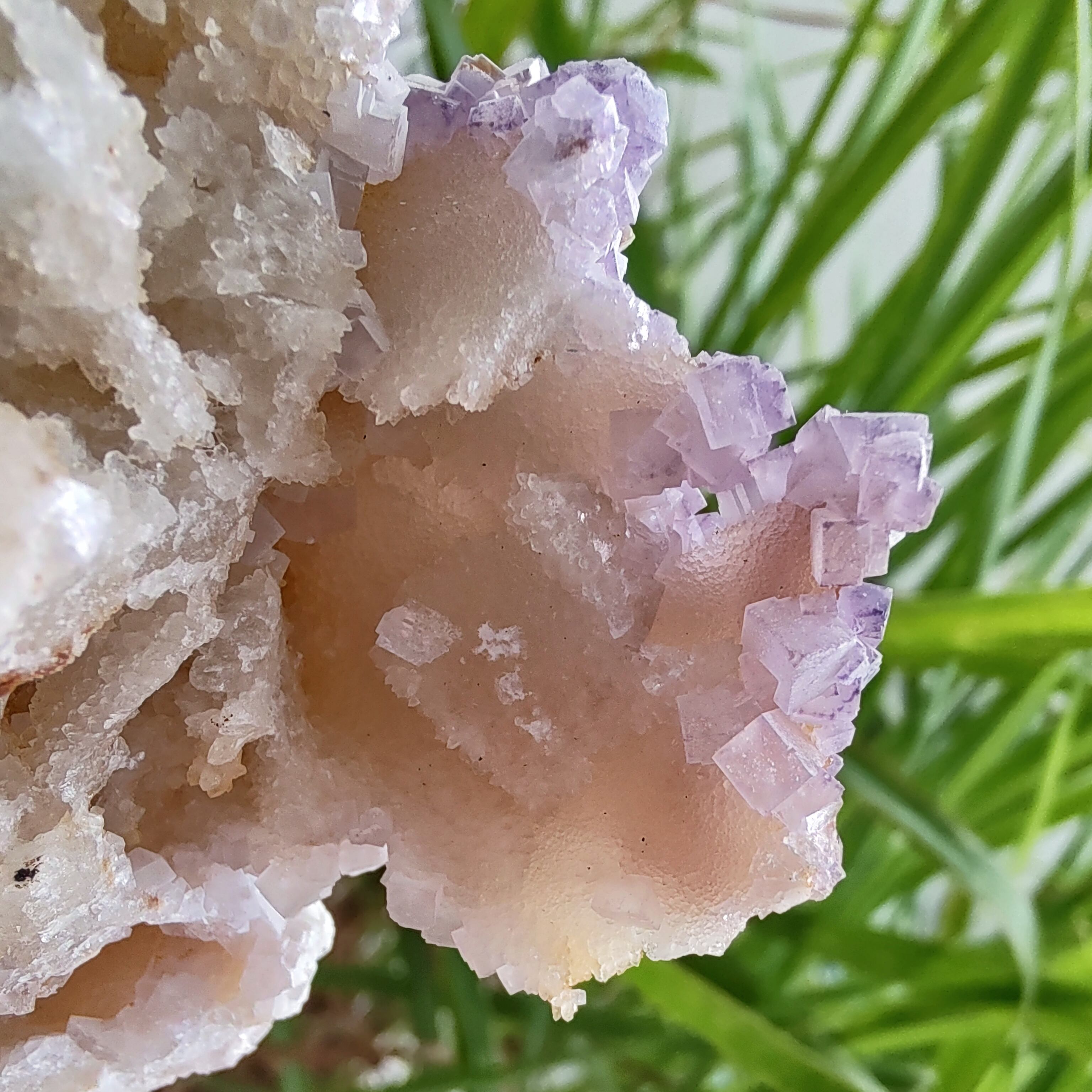 こちらはカルサイト上に薄い紫色と白いと黄色と透明なイットロ蛍石が共生しています。 いろいろなサイズのイットロ蛍石があります。とても細かな結晶ですが、ルーペなどでご覧頂くと繊細で美しい世界が見えます。