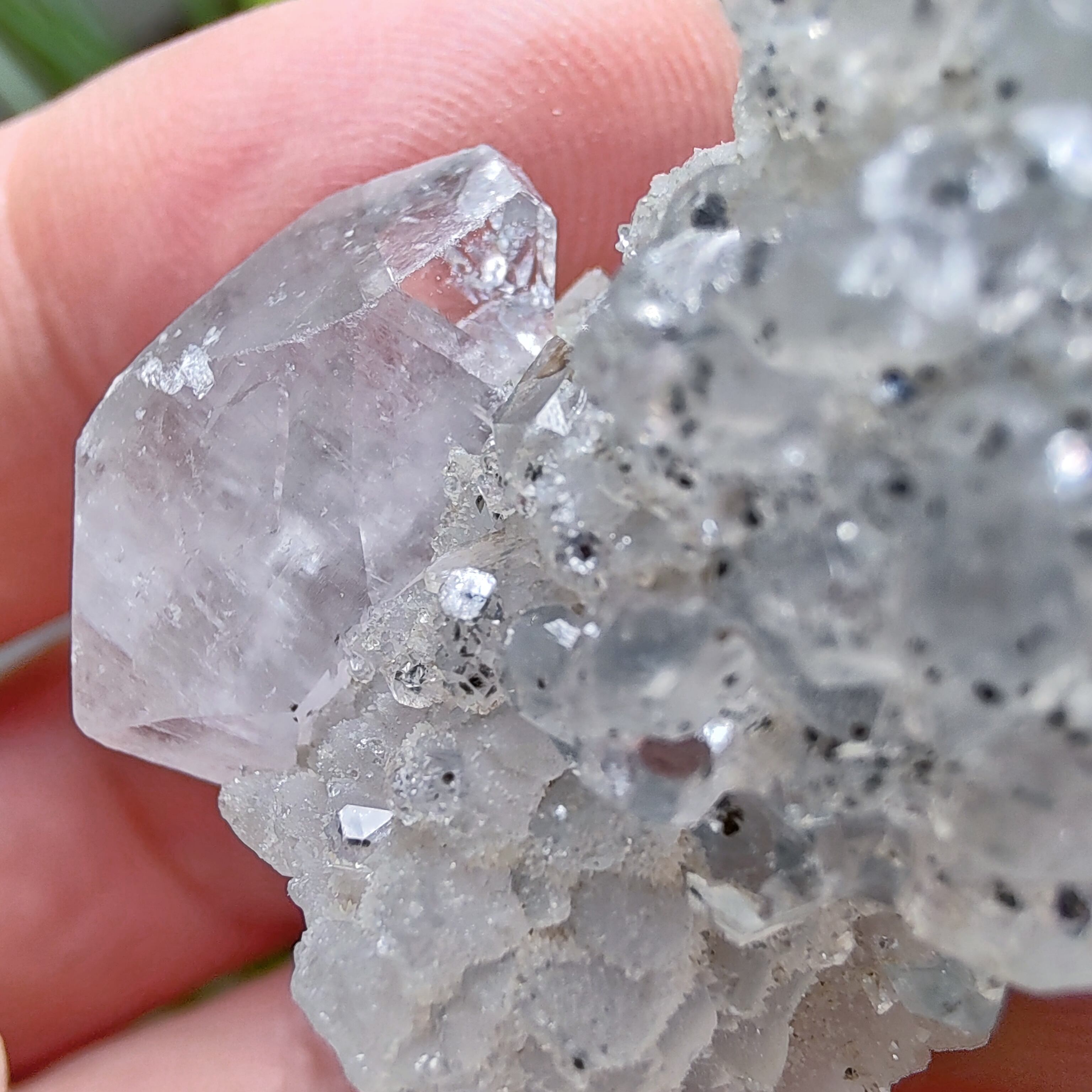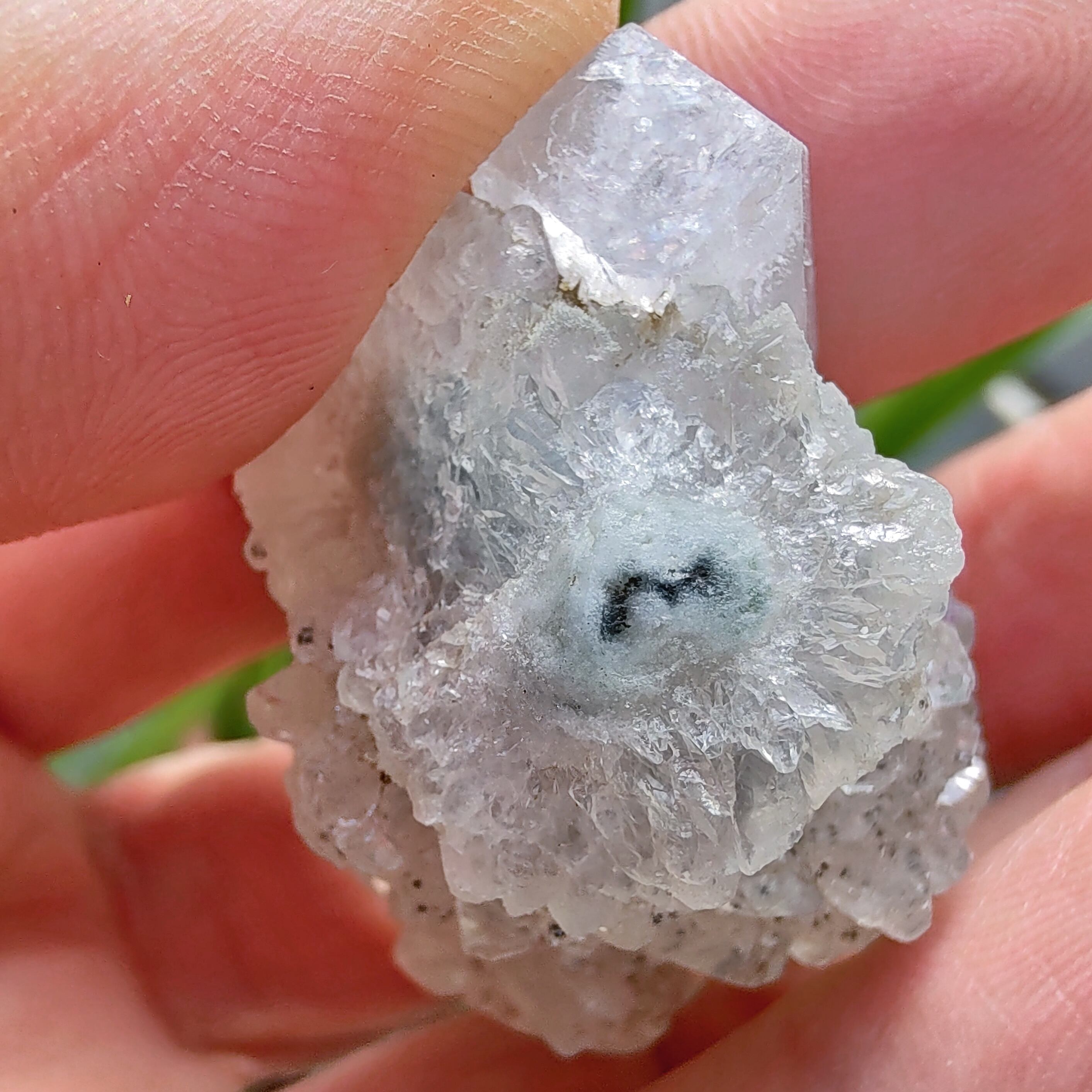 こちらはアポフィライトです。市場ではまずお目にかかることのない超希少品です!透明感溢れるクリアアポフィライトの全体を小さな結晶が覆った、希少なタイプになります。光沢感が強いように感じられて、形状の完璧な結晶と強い対照をなしている。小さい結晶達が、虹があるので、細かな光を反射してキラキラします。