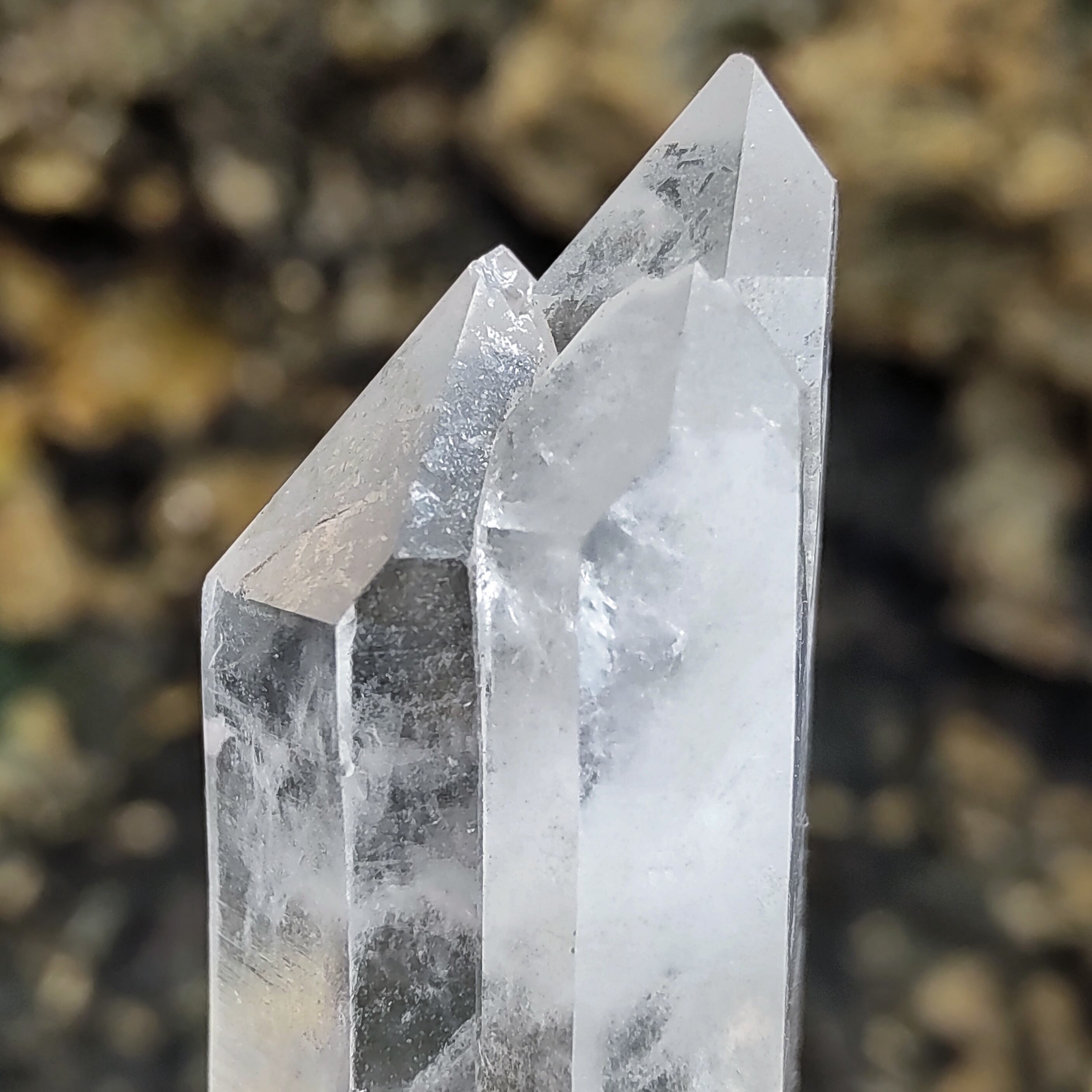希少価値の高い照り艶良くタントリックツインのレムリアンシードです。虹が沢山あって、氷のような美しさを纏い、横に刻まれた水晶の成長線であります。小さい水晶の先端部にイシスがあるので、神聖ような輝きを放ちます。3つのクリスタルが共通(一つ)の根元から成長していますので、タントリックツインと言います。人と人との結びつき、更にはあらゆる物ごとに対して調和をもたらしてくれるといわれています。