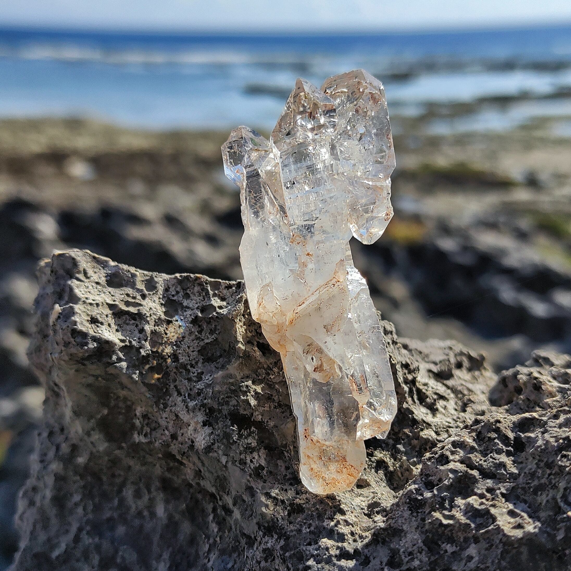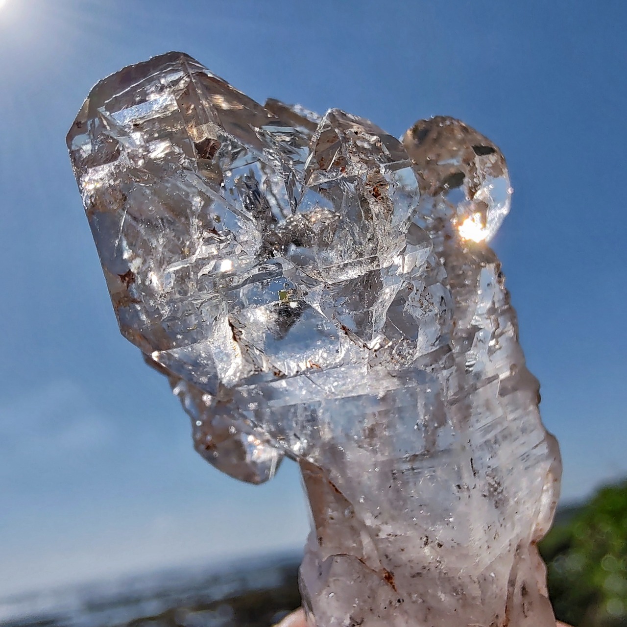 希少な透明抜群のスケルタルクォーツで、ハーキマーダイヤモンド。完全なダブルターミネーテッド(両剣水晶) が沢山集まっていますので、とても珍しいですね。手元をきれいに演出してくれます!