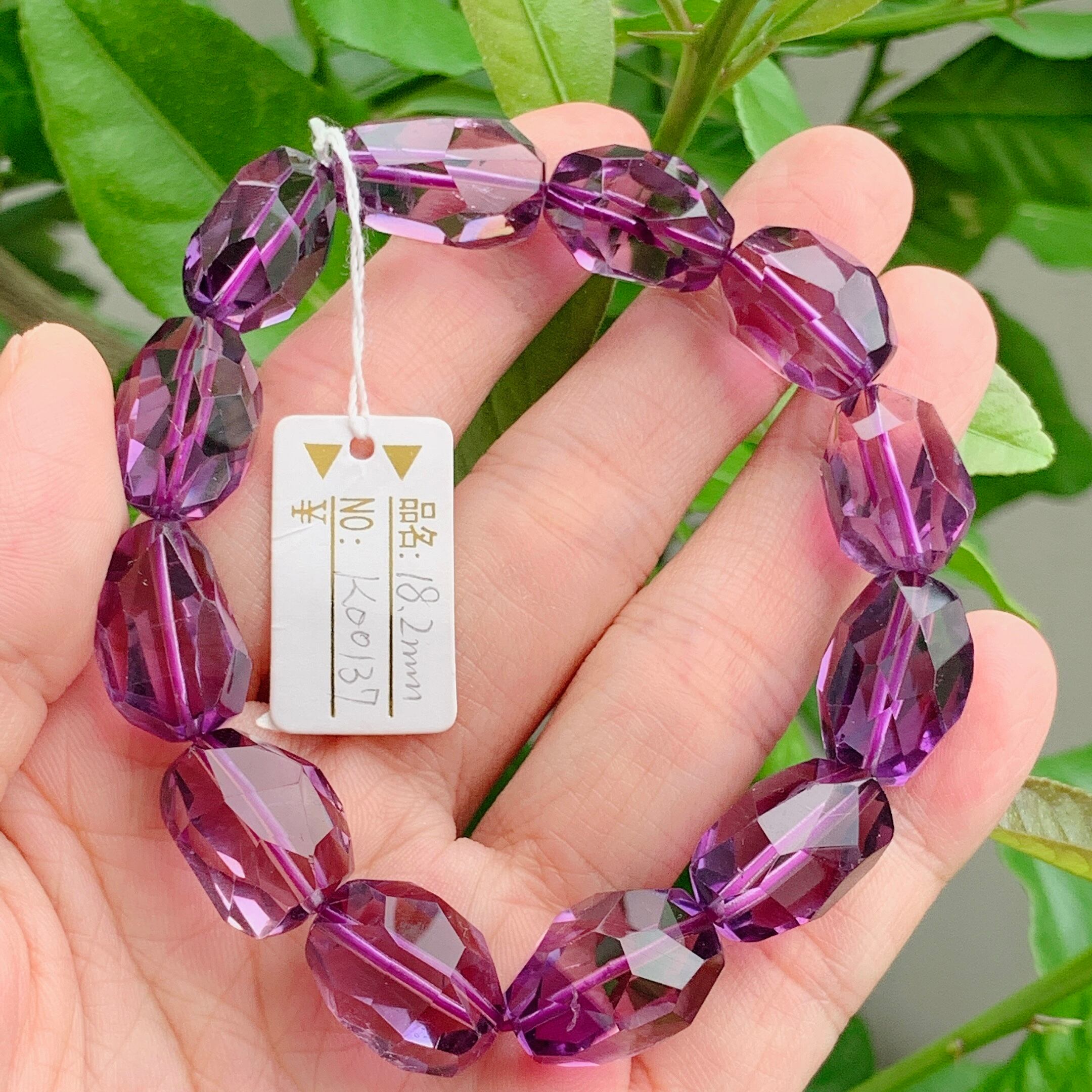 ウルグアイ產大粒のアメジストです。濃い紫色で、透明感拔群、透過光でピンク紫色になって、キラキラして、極上品です。アメジストの中には成長紋様があるので、とても希少です。こちらブレスレットは大粒ですが、女性がつけても素敵です。