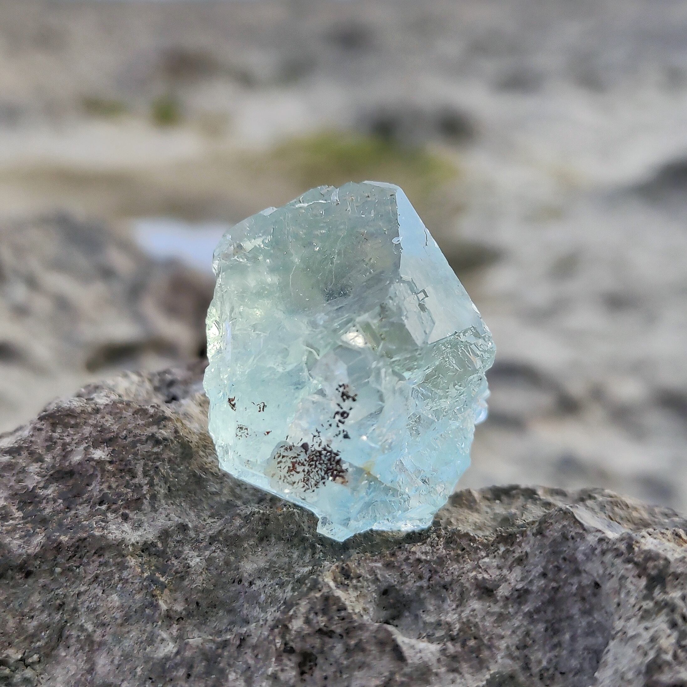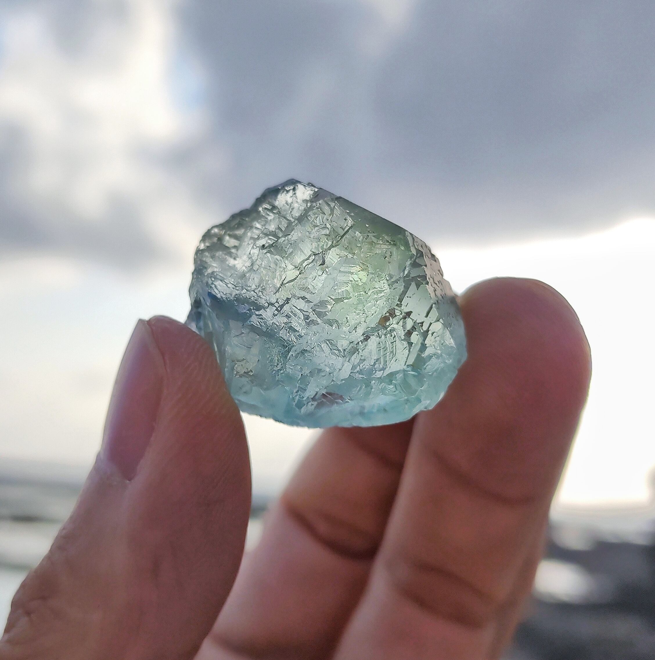 超クリアな透明抜群なフローライトです。薄いグリーンとテリが共に非常に素晴らしいです。見応えのあるステップ状結晶とアップルグリーンの爽やかな色合いに目を奪われます。こちらの内部には山のような青いものは特別なので、ユニークで素敵な鉱物標本だと思います。