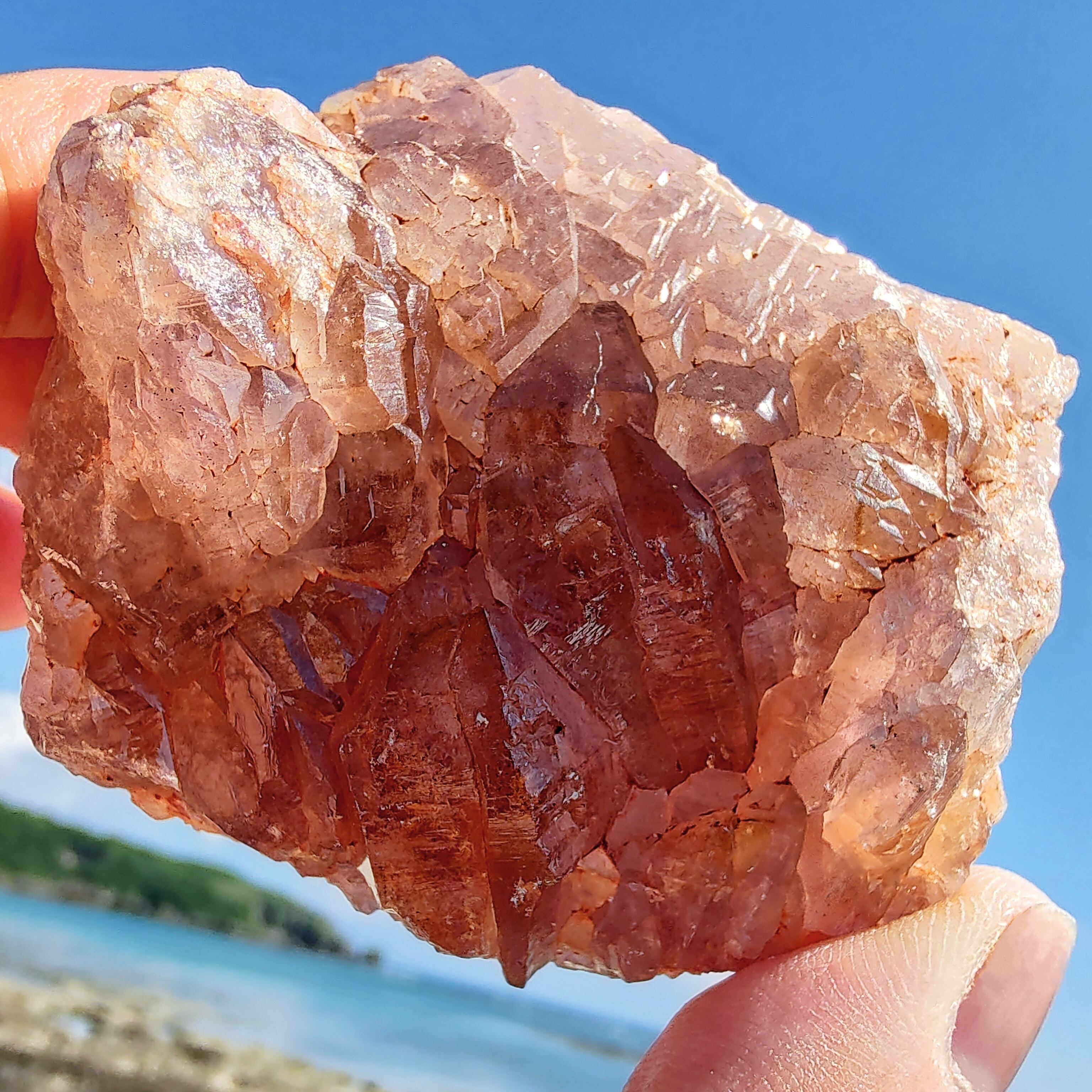 希少なピンクと紫の細かいきらきらしたアメジストダブルターミネーテッド(両剣水晶) 完全な結晶が沢山混ざり集まって、1つクォーツクラスターになっています。太陽の光に照らされて、キラキラした。パープルもピンクパープルになって、とても珍しいですね。ダークトーンを含んだ色味で、不思議で高貴なエネルギ ーを感じられます。