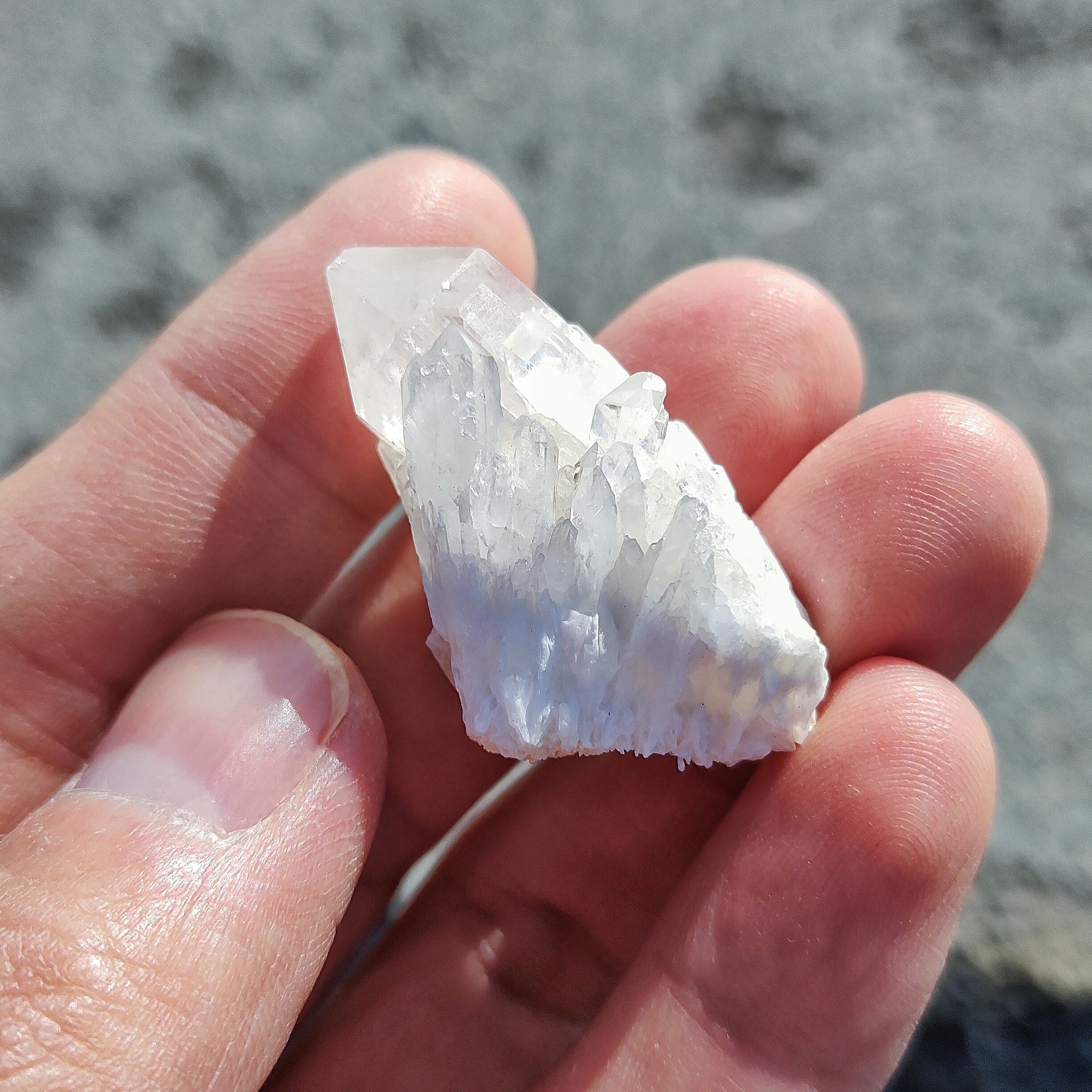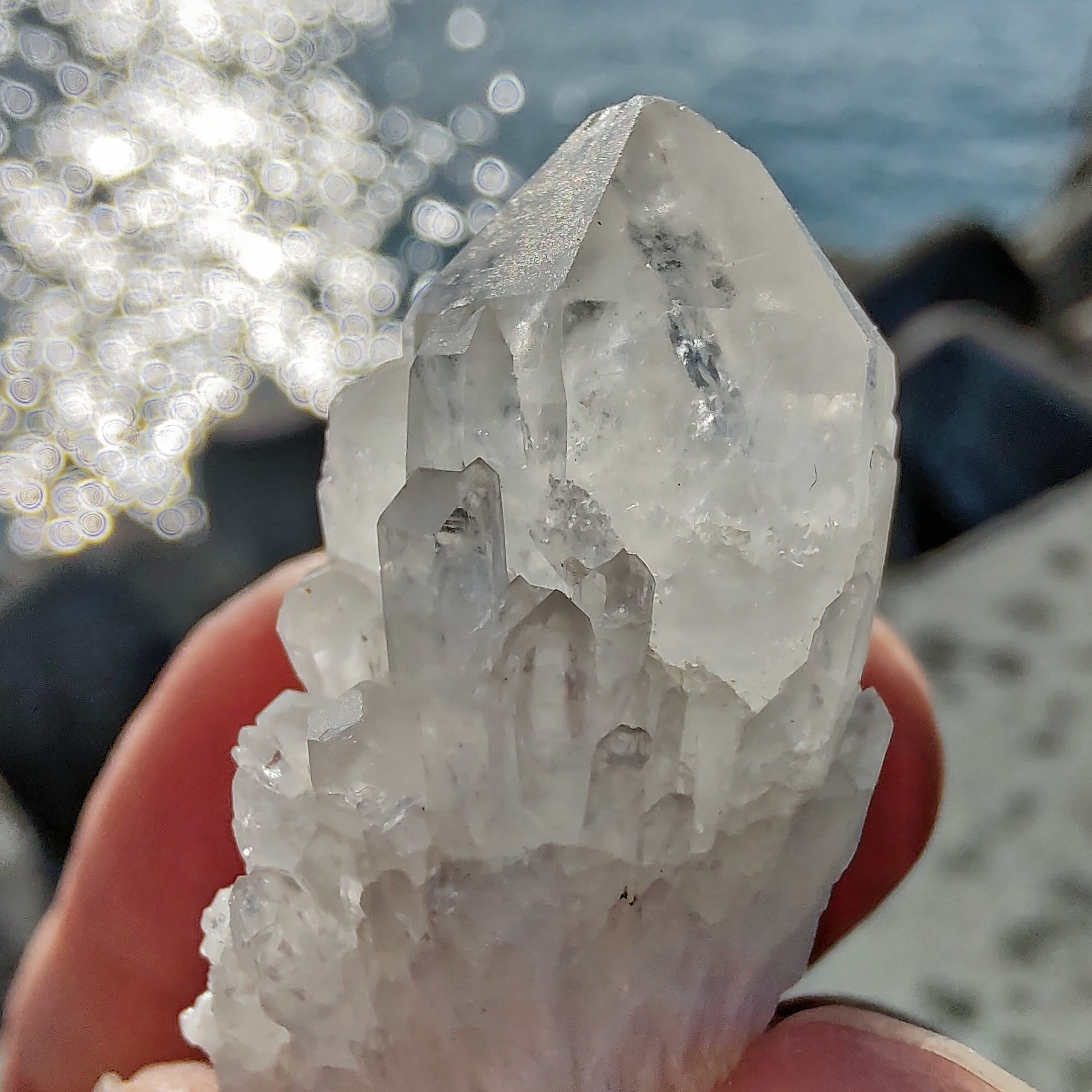 透明感がある、大変美しくて白いクンダリーニクォーツになっております。ポイントの周りには、完全で小さい結晶が群生している、クラスターを形成しているものもあって、陽光の下キラキラした。日本の市場ではあまりお目にかかれない逸品となっております。