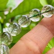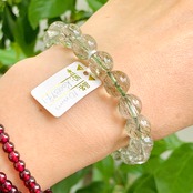 若草を透明度の高い水晶の中に閉じ込めたような爽やかなブレスレットです。グリーンエピドートはエピドートグループの中で鉄を10%以上含有したものを指し、柱状の結晶が密集して構成されています。その様子からギリシャ語で増加という意味を持つ「epidosis」が語源になったといわれており、和名では緑色の簾(すだれ)のようだということで「緑簾石(りょくれんせき)」と呼ばれています。