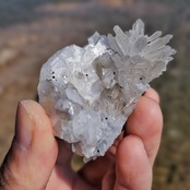 こちらは内モングル產クォーツクラスターとモスコバイト(白雲母muscovite)が共生した標本です。クォーツやモスコバイクは透明度高くて、虹もあって、陽光の下キラキラした。更に、花のように、市場でユニークだと思います。クォーツの中、マイカの黒い粒を沢山見ており、美しい逸品です!