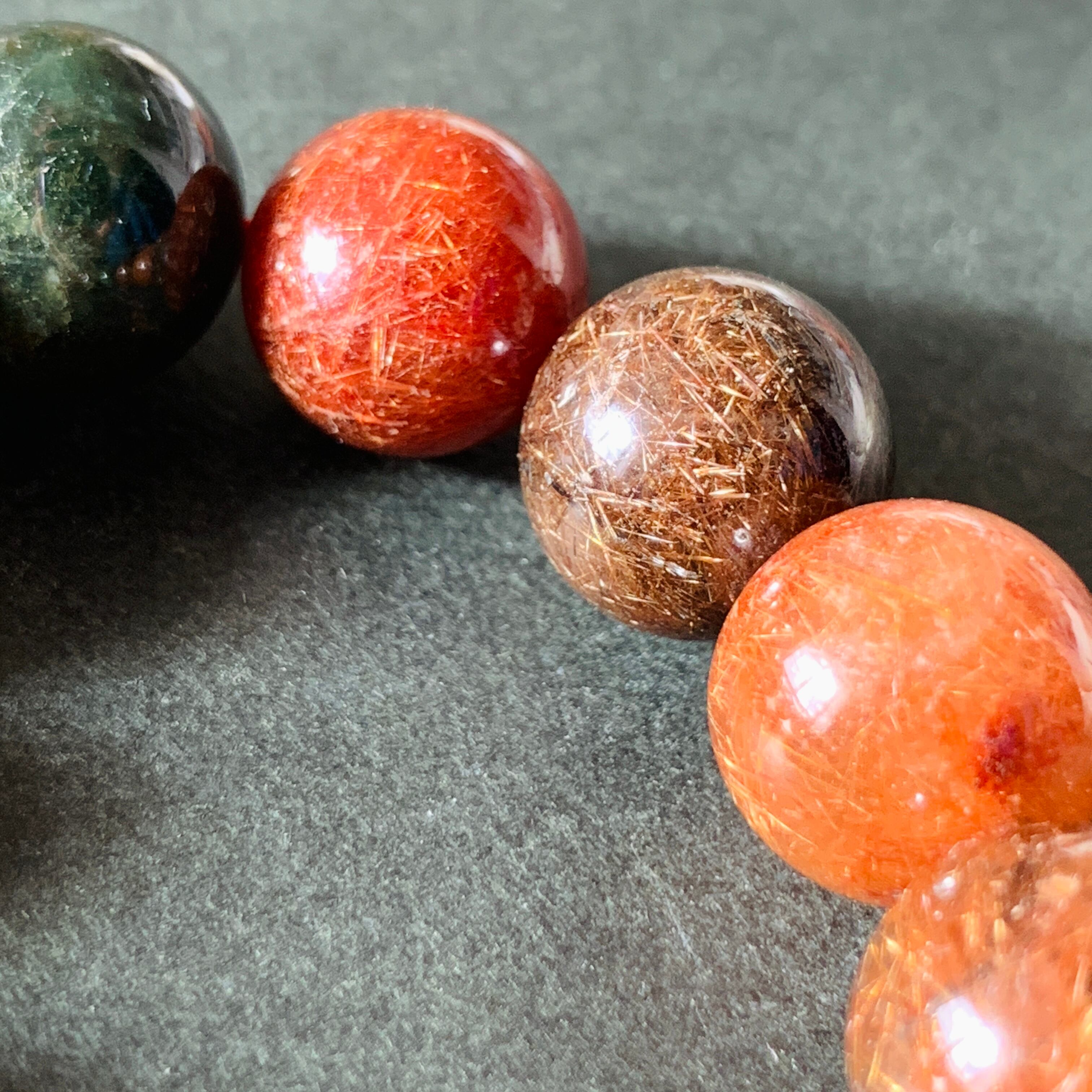 発色極上、水晶玉の中にふさふさした輝くルチルは気品を感じで、13.6ミリのミックスルチルクォーツです。このブレスレットには赤褐色、黄褐色、褐色、緑色がある、優しい色合いで肌なじみも抜群です!