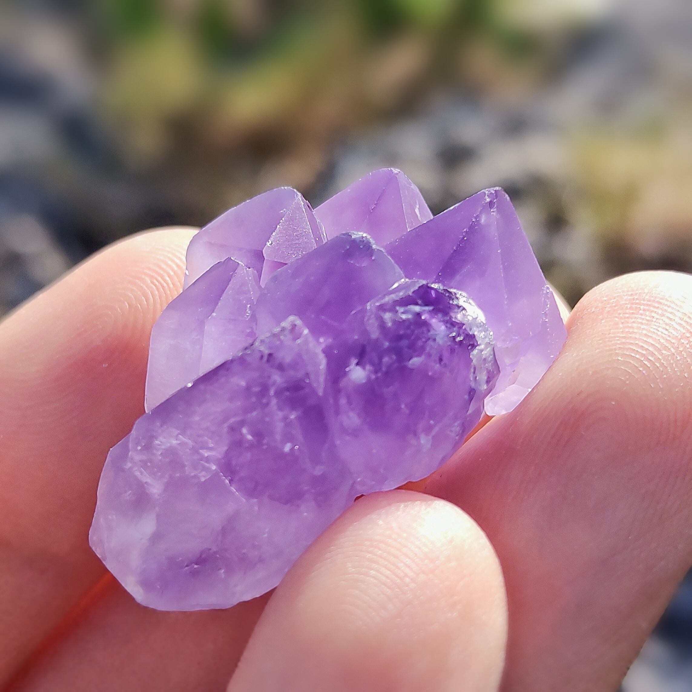 可愛いアメジスト クラスター。太陽の光に照らされて、キラキラした、パープルもピンクパープルになって、完全なダブルターミネーテッド(両剣水晶) が沢山集まっていますので、とても珍しいですね。