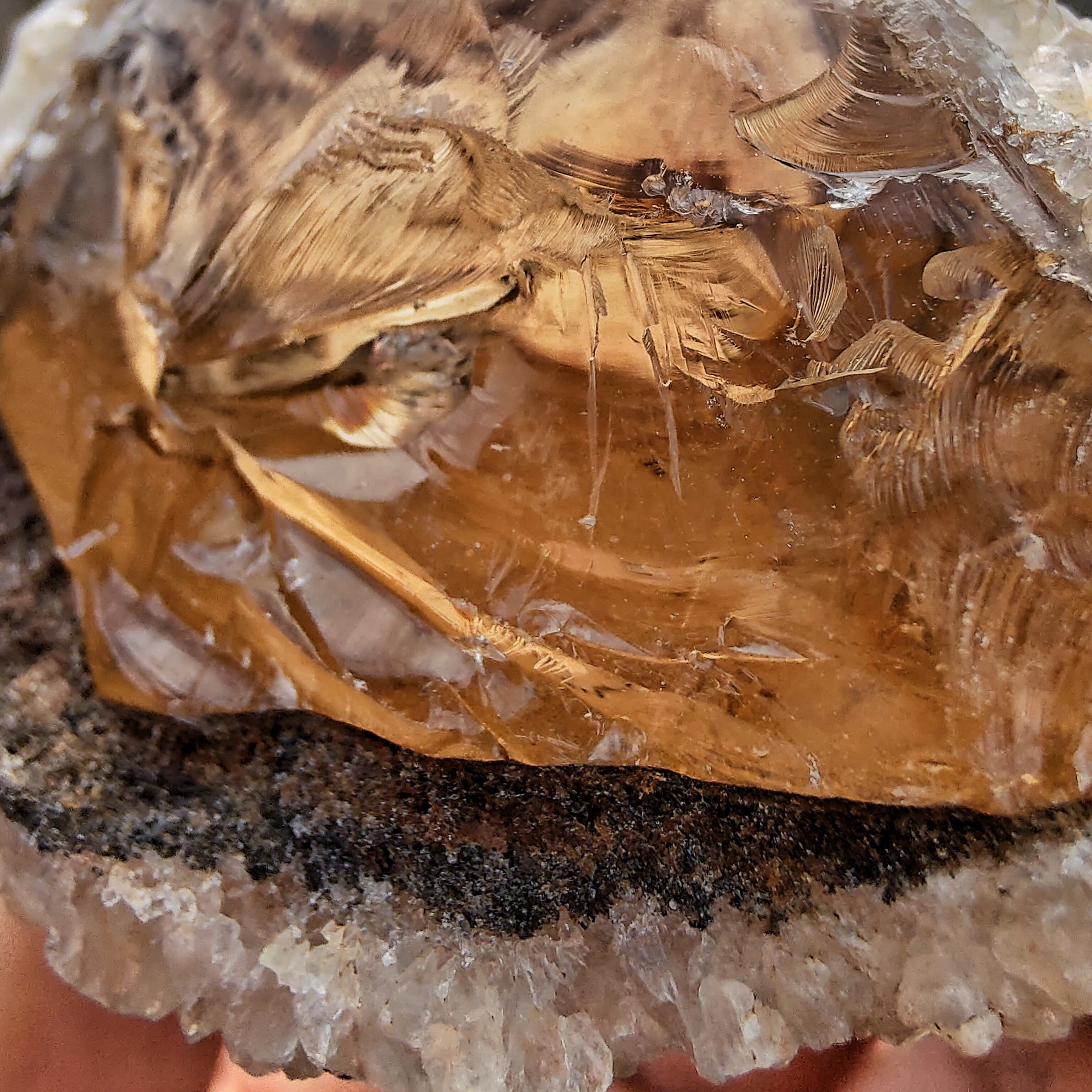 とても希少なクォーツクラスターです。こちらクォーツのコアは濃い色のスモーキークォーツで、透過光で美しいの色合いが確認出来て、全体を透明感溢れるクォーツクラスターの結晶が覆った、希少なタイプになります。写真より、実物はもっと美しく見える✨ スモーキークォーツとクォーツクラスターの間に母岩の層が見えますから、クォーツが再結晶や二次成長が見られ、複雑さと生命力も増し加えられて見応え十分で、逸品のはずだと思います。