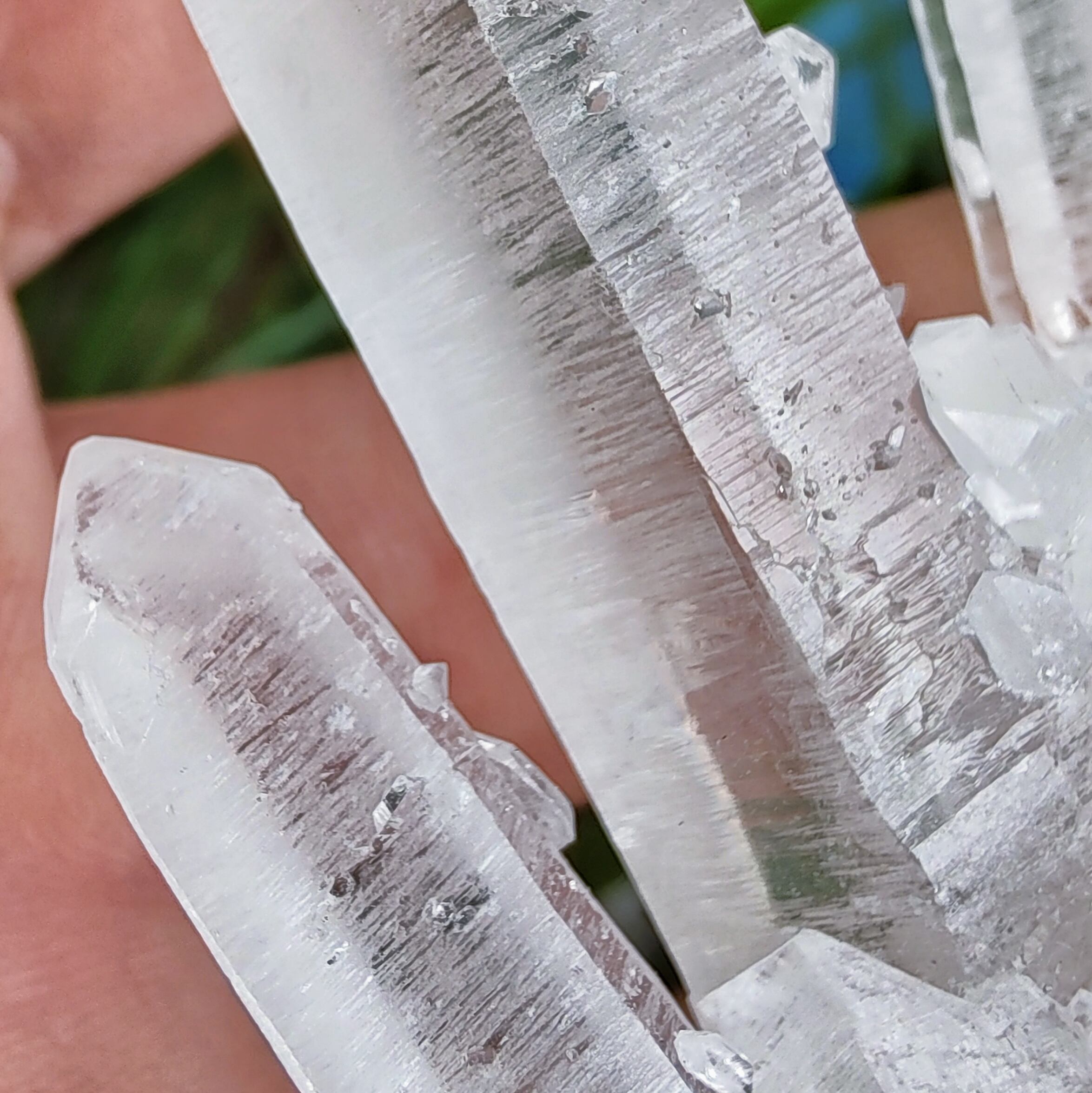 希少な透明度が抜群、照り艶良く、綺麗なレムリアンシードのクラスターです。3本大きいクォーツがトライデントのように立てている。周りに沢山の小さい結晶が絡み合う形成されて、とても綺麗ですね!氷のような美しさを纏い、神聖な輝きを放ちます。こちらクォーツはイシスの特徴もあって、不可思議なを持っているようです。
