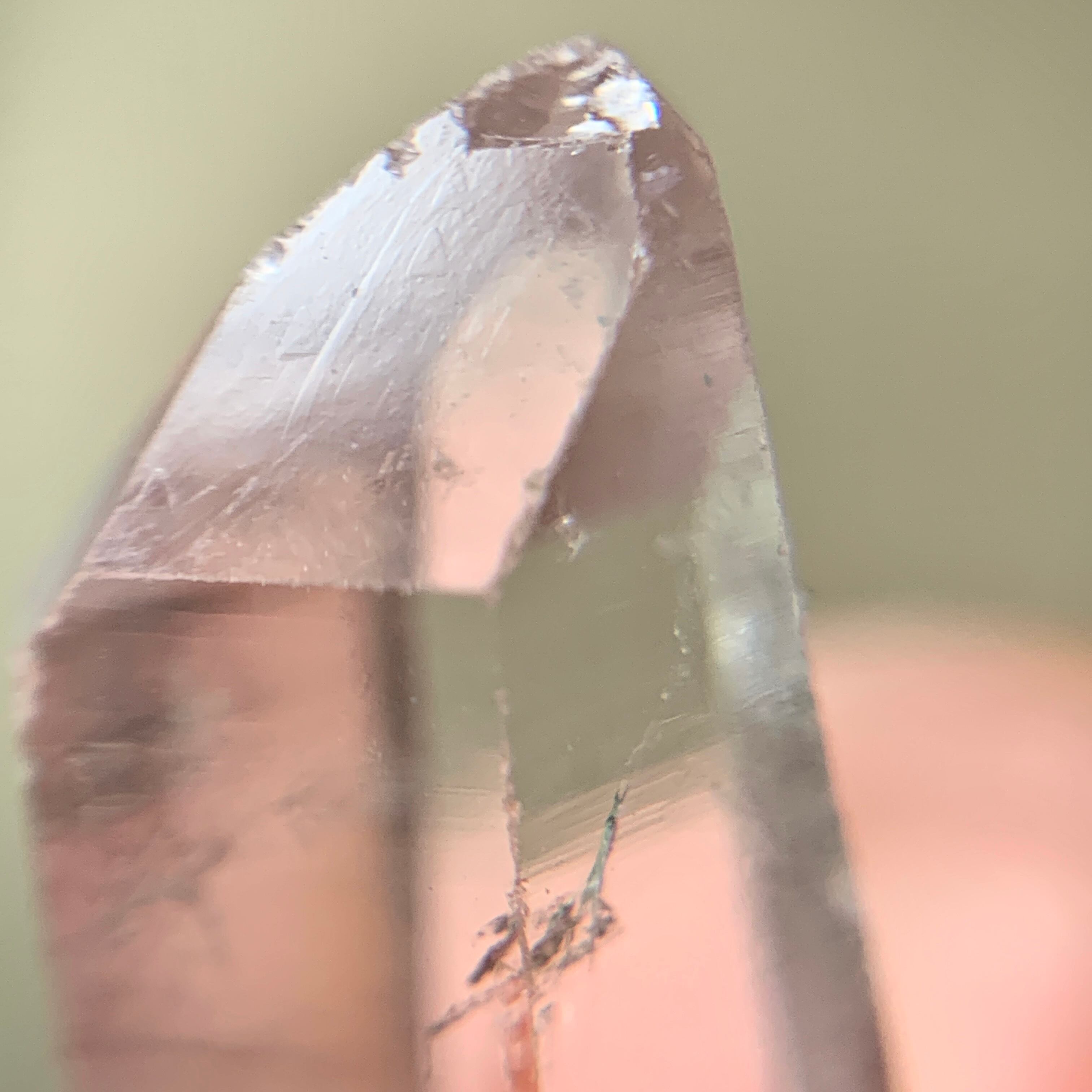 透明感が抜群、大変美しいレコードキーパーになっております。シングルポイントで、小さいですが、锥面には三角形を見られて、クォーツの中には氷状の山型がいるものもかすかに見られます。希少な不可思議なパワーを持っているようです。