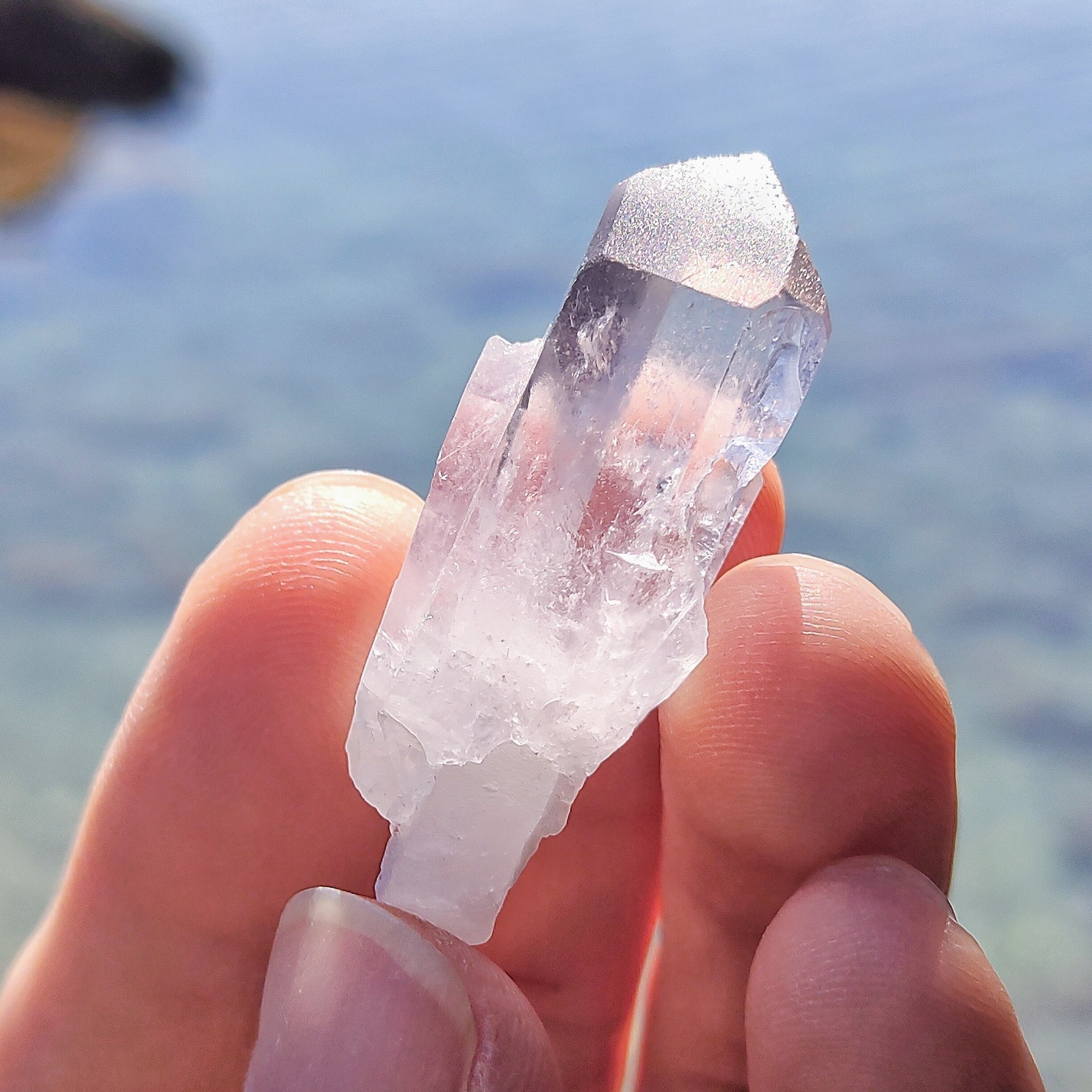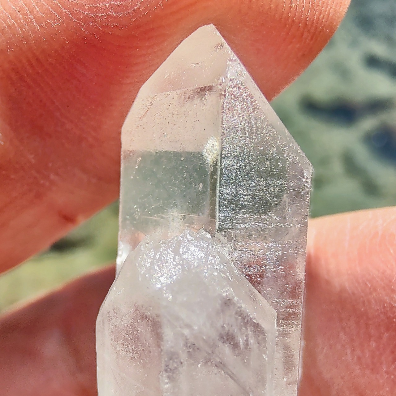 こちらは希少な透明度高くて艶もあった、光あふれる出るようなツインの松茸水晶です。クォーツの锥面にはマクロレンズで逆三角形▼の凹凸が見って、強いエネルギーを持っているようです。タイムリンクとゲートウェイ(キー)の特徴もあって、珍しいです。