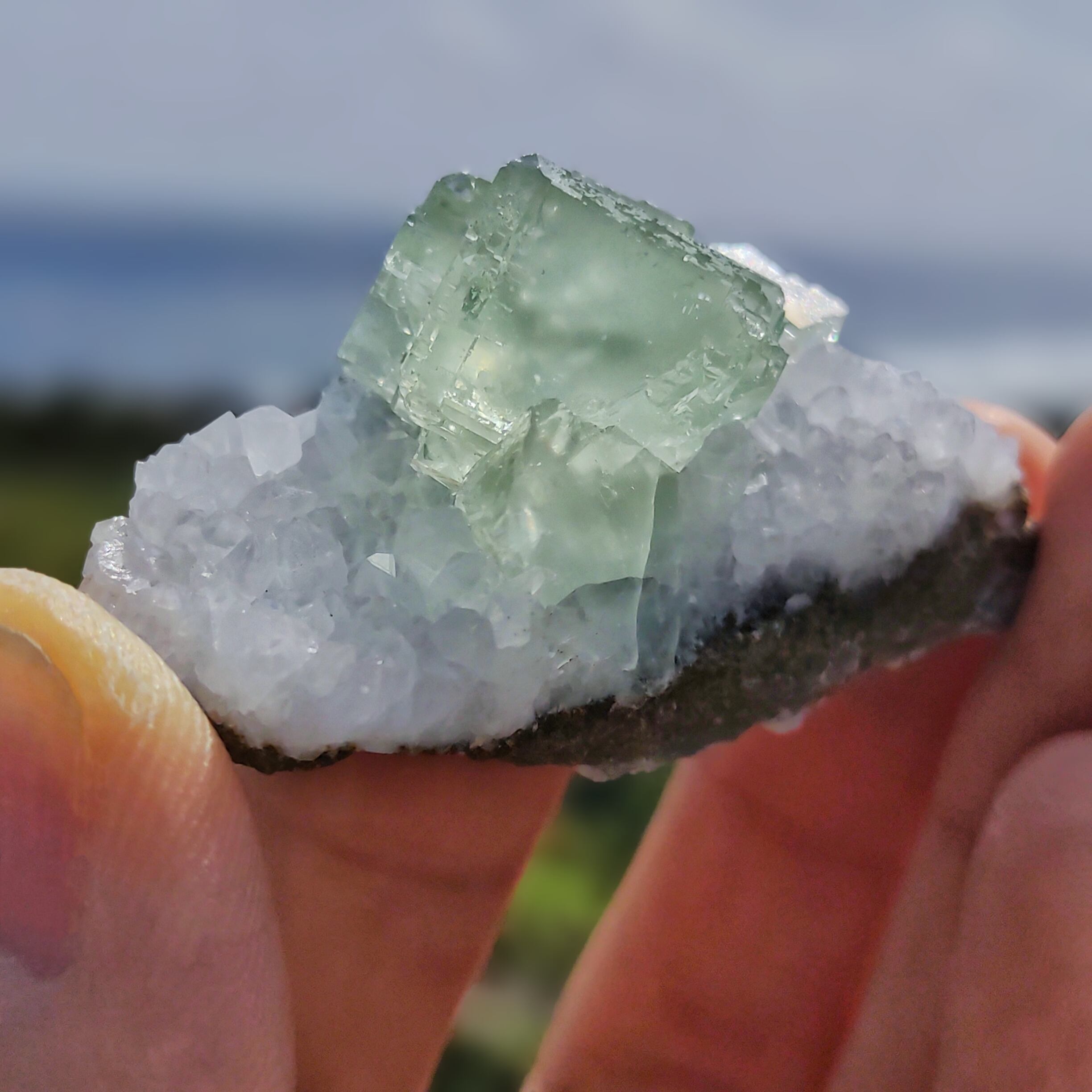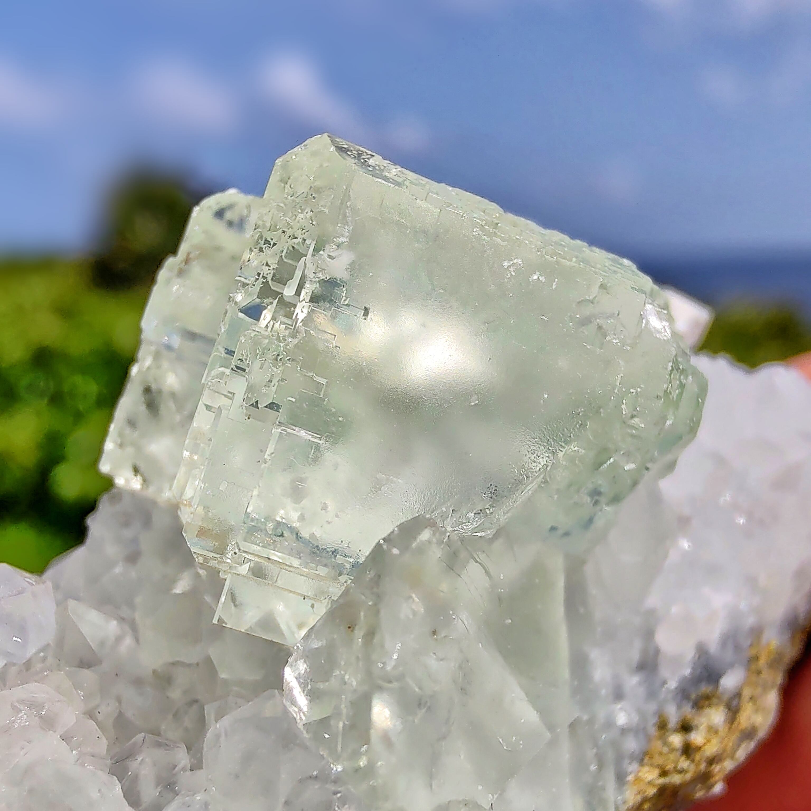「天空の城」超クリアな美しいフローライトです。ステップ状で淡いグリーンのフローライトは白いカルサイトの上に立ている、天空の城みたいですね。