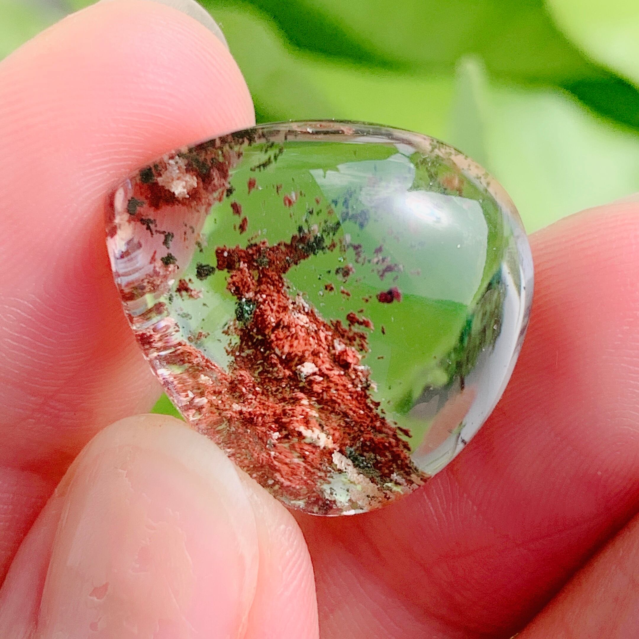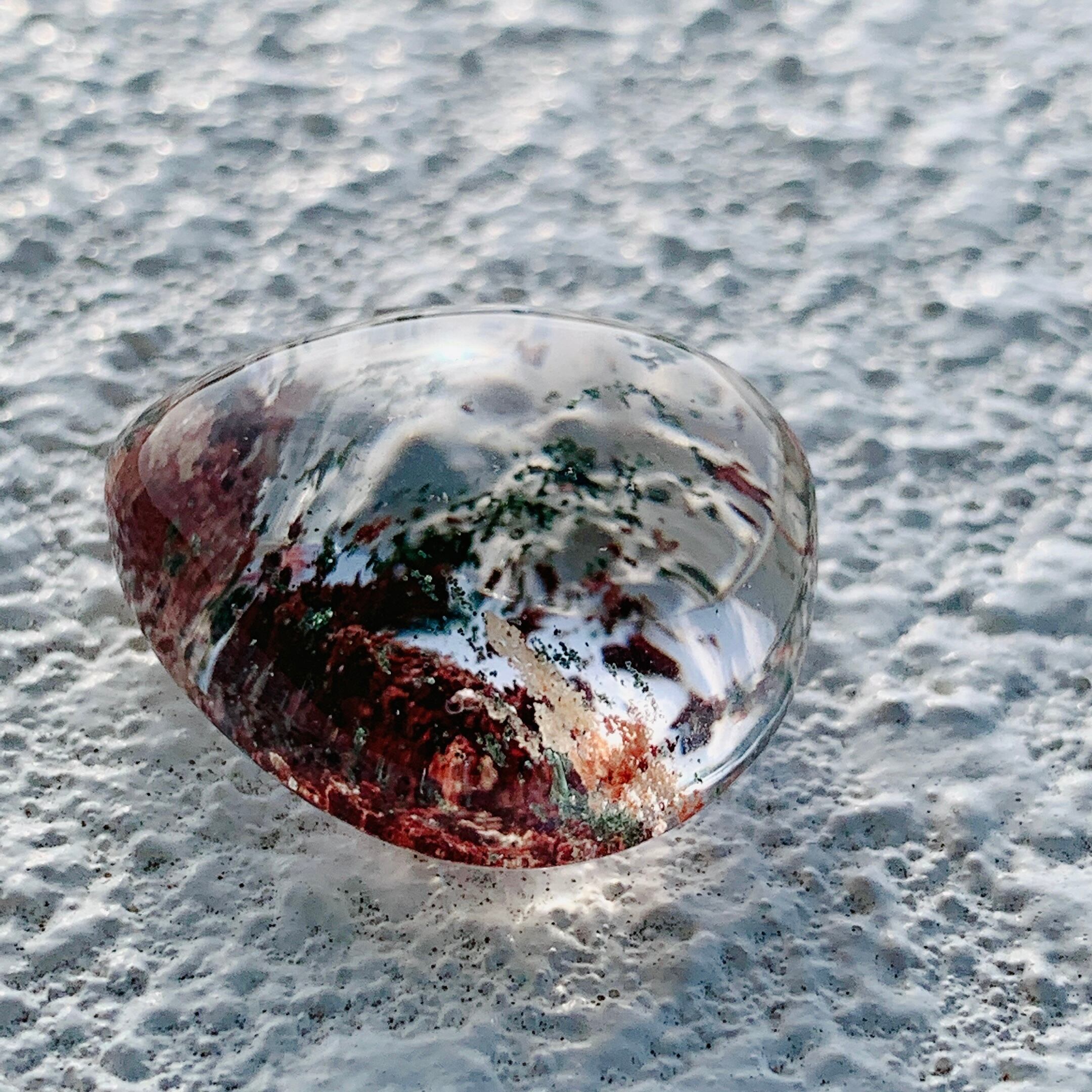ブラウンとグリーンの内包物が透明抜群な水晶の中で含まれています。研磨も美しくて、秋の感じがします。優しいですね。