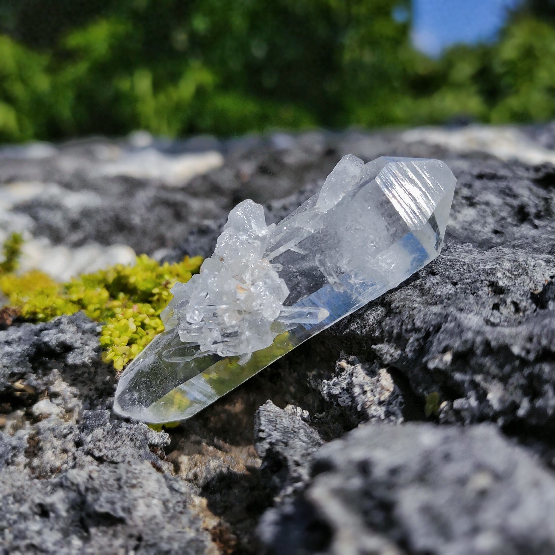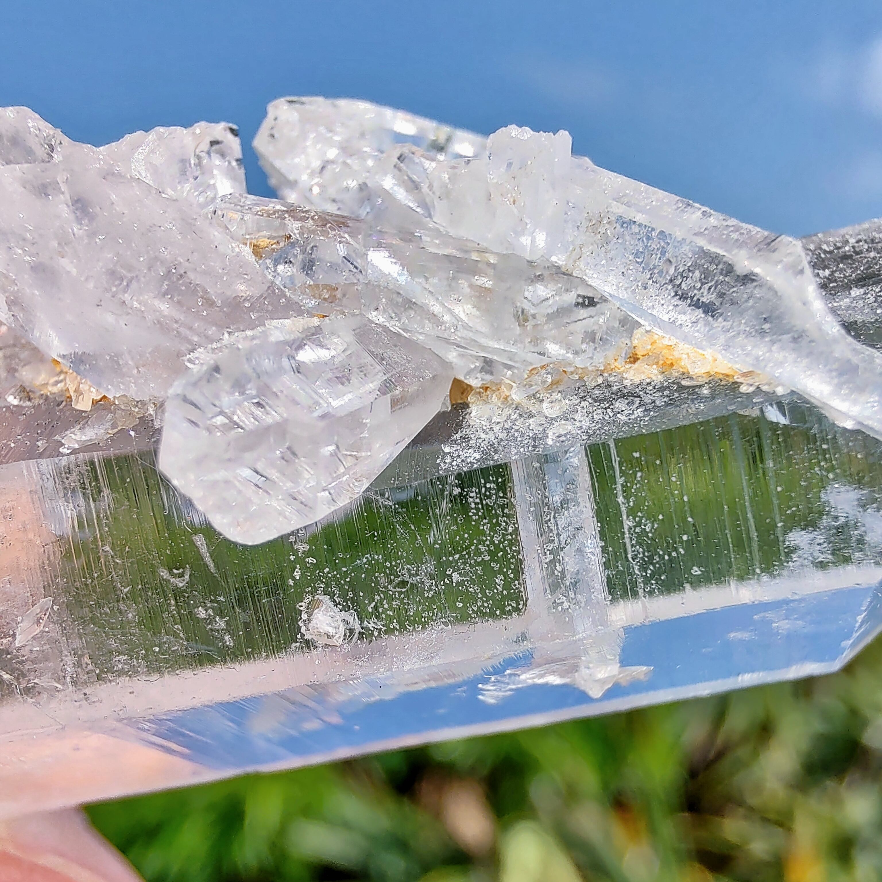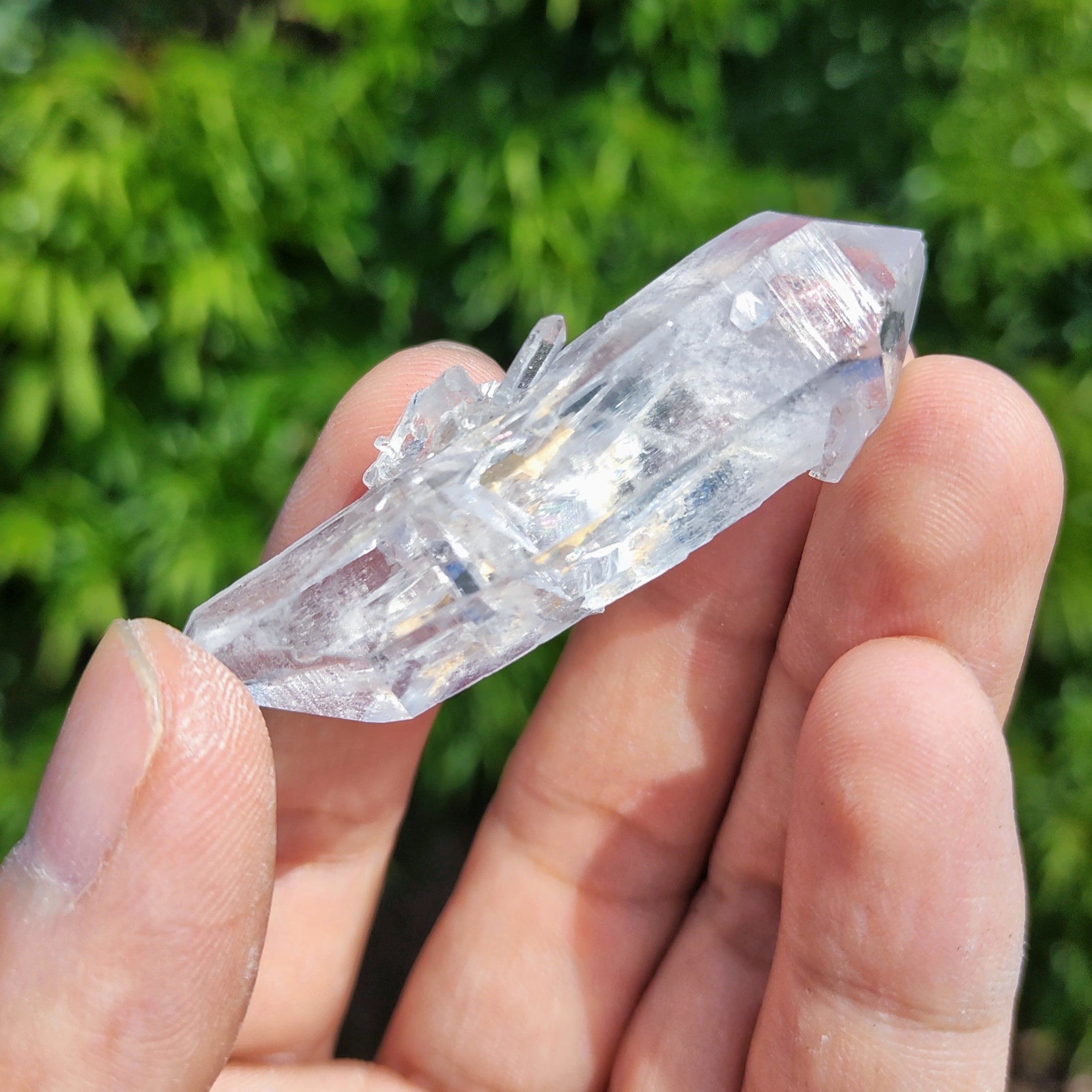 こちらはダブルターミネーテッドのレムリアンシードです。氷のような美しさを纏い、横に刻まれた水晶の成長線であって、錐面に七角形の大きな面が見て、背面三角形の面を持っています。小さいクォーツは完全で、透明感高くて、交互成長は独特の造形を形成する。チャネリングクリスタルはその名の通り高次元からの情報と交信し、その知恵を聞くことができるクリスタルといわれ、持つ人の潜在意識を引き出し成長させてくれるとされています。こちらクォーツクラスターには石中石を見えている、素晴らしい石だと思います。