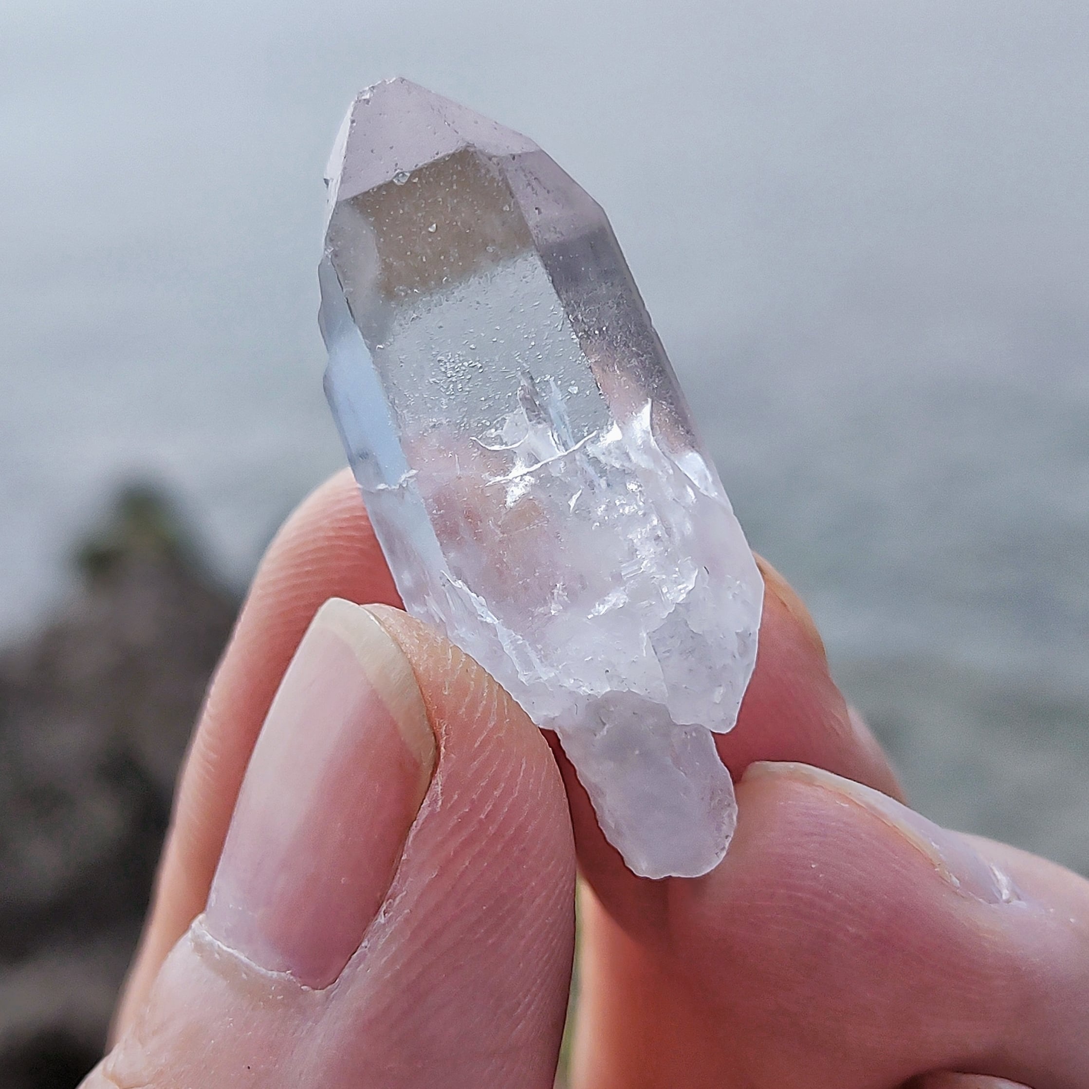 こちらは希少な極透明で艶もあった、光あふれる出るような松茸水晶です。クォーツのどの锥面にもいっぱい逆三角形▼の凹凸が見って、強いエネルギーを持っているようです。これはお珍しい。水晶の柱面に六角形の凹みが見られる、キー(鍵穴)という名前が意味するように、別世界(次元)への扉を開きアクセスすることを可能にする水晶と言われているので、ミステリーです。