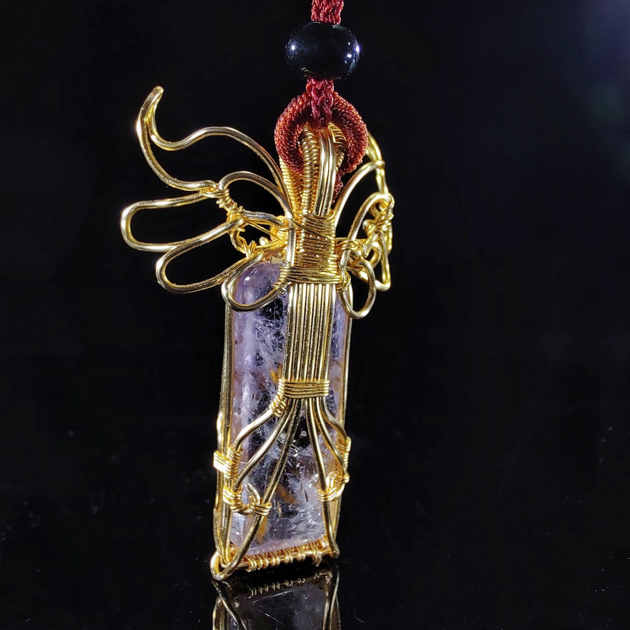 こちらペンダントトップは「天使の羽翼」と言われています。柱状のカコクセナイト(又名:カコクセナイトインアメジスト、インクルージョンアメジスト)の中でゴールドに煌く個性的な内包物が大変美しい。透明感が抜群。