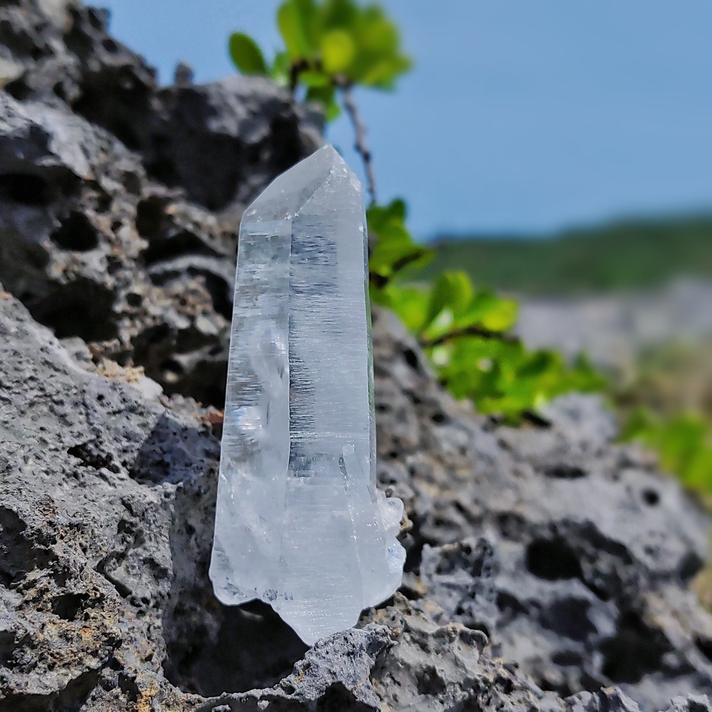 こちらはダブルターミネーテッドのレムリアンシードです。氷のような美しさを纏い、横に刻まれた水晶の成長線であって、素晴らしい石だと思います。